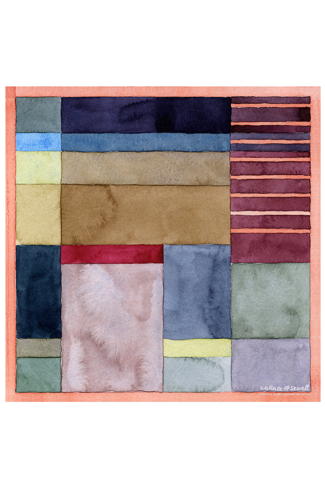 Soft washes of navy, plum, ochre, and muted greens are framed in coral, creating a balanced design of bold rectangular blocks with a rhythm of horizontal stripes.