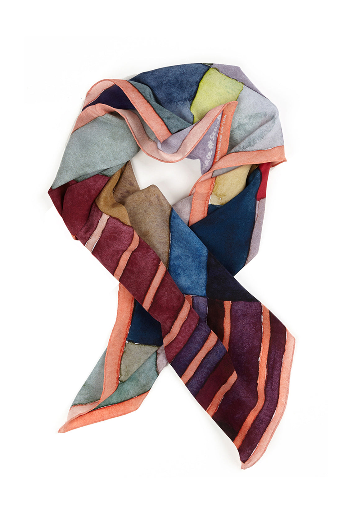 Printed on lightweight silk crepe de chine, the scarves drape beautifully and come in various sizes, including a pocket square.