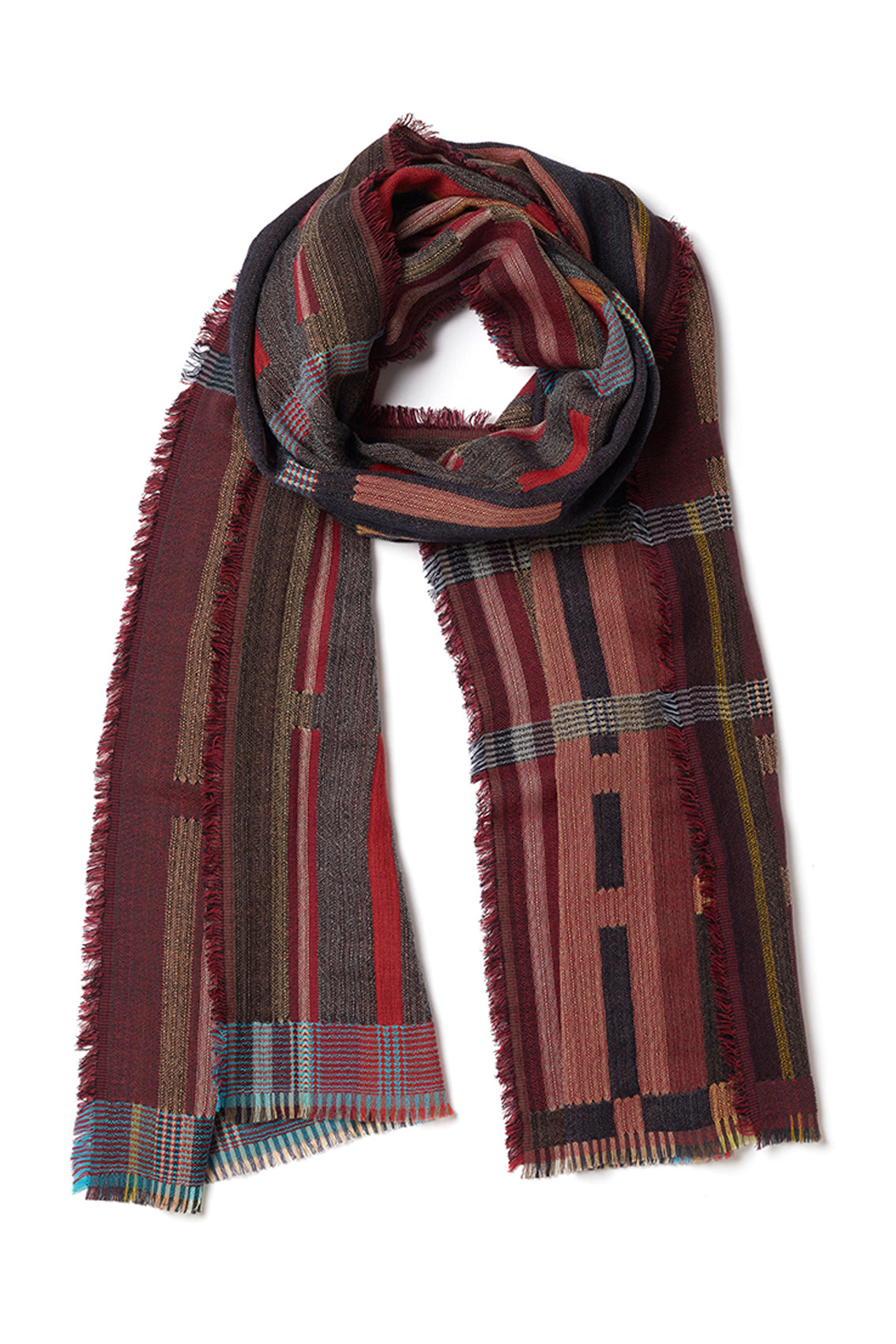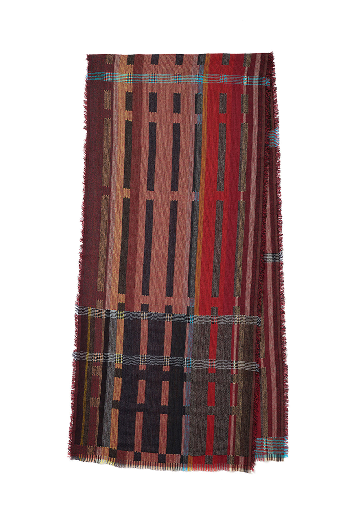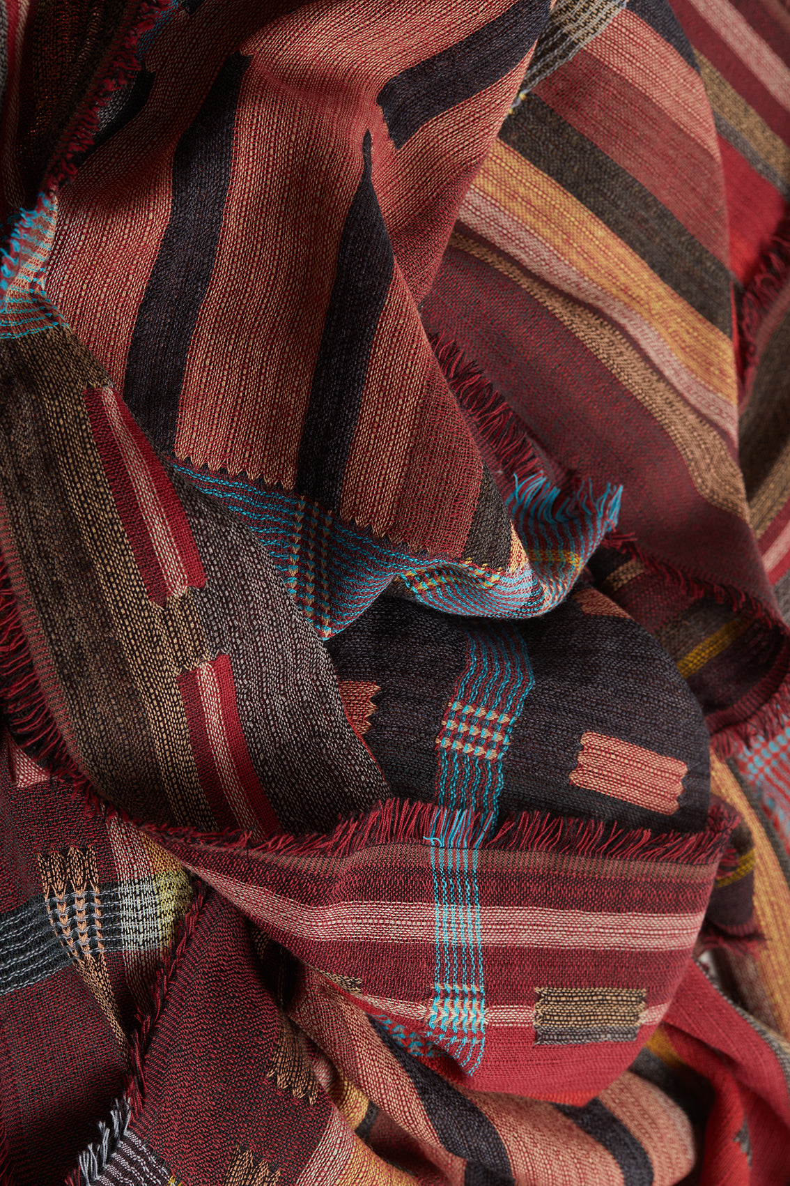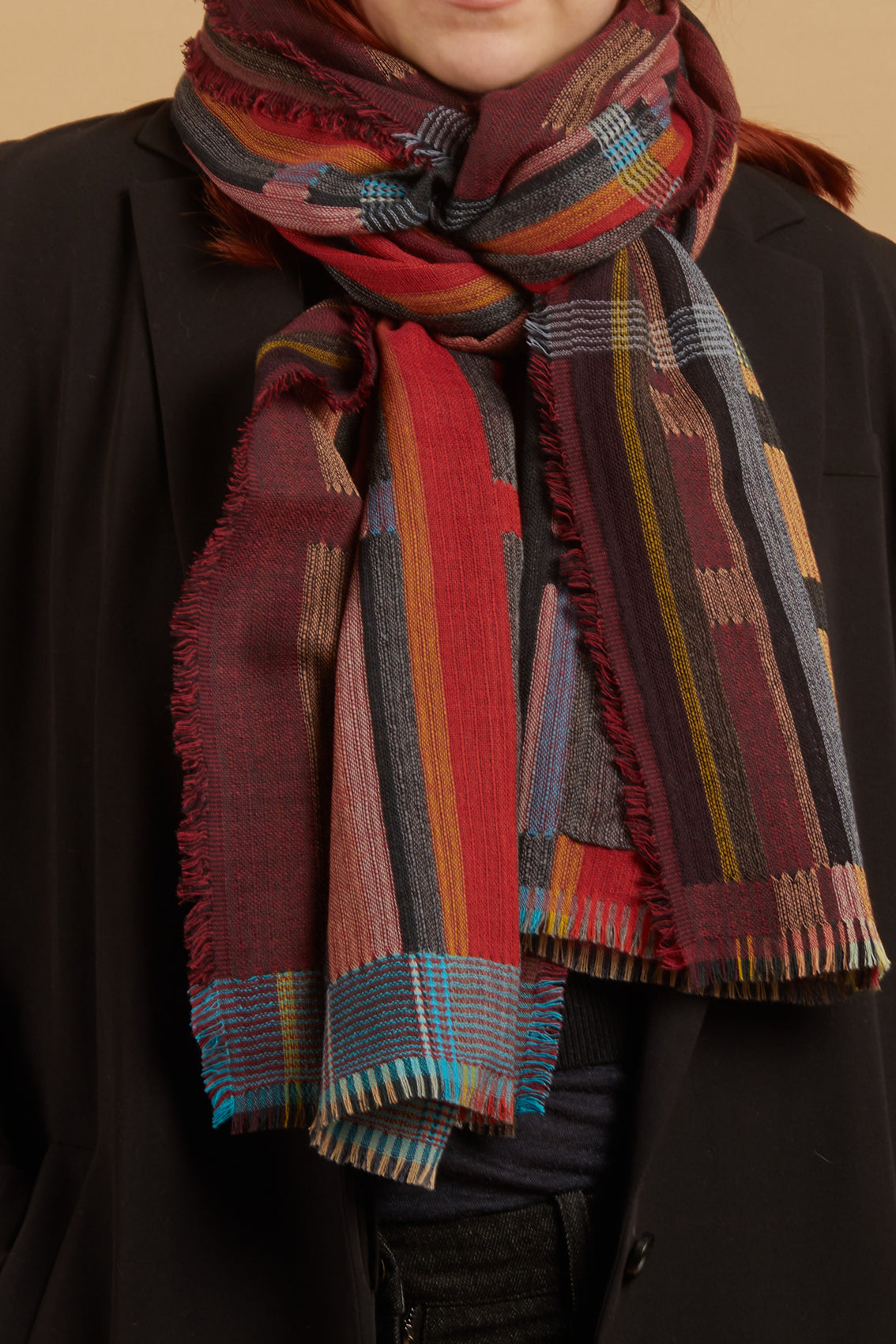 A delicate and elegant fine wool wrap, double-sided to offer two designs in one, featuring bold geometric blocks throughout.