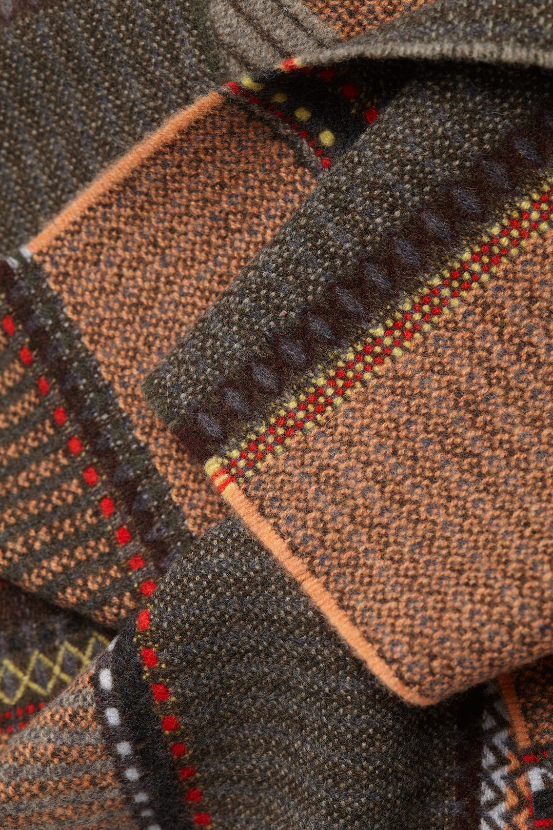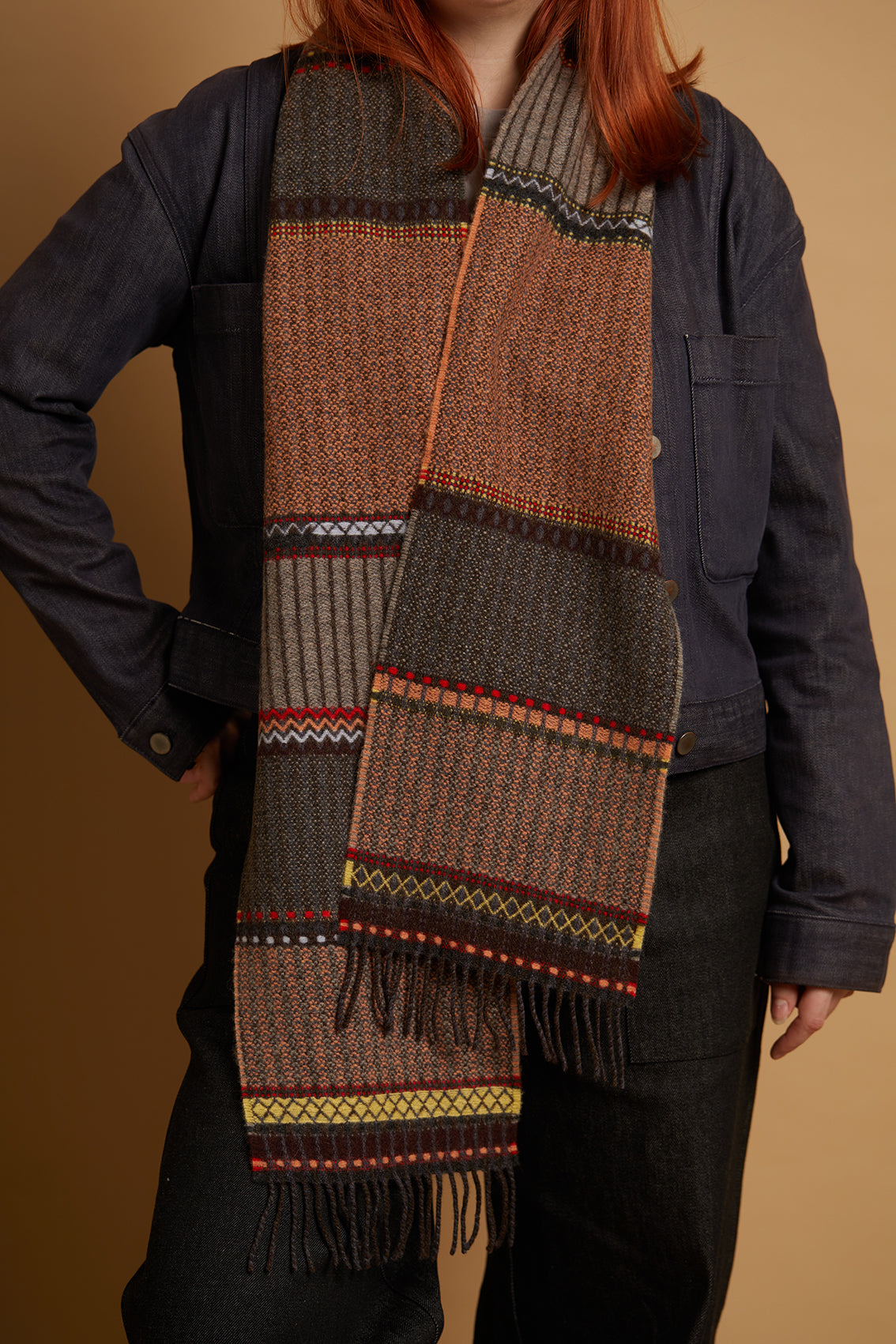 Cassia is a decorative scarf featuring large bands of texture, broken up by stripes of woven patterns in fun pops of contrasting colour.