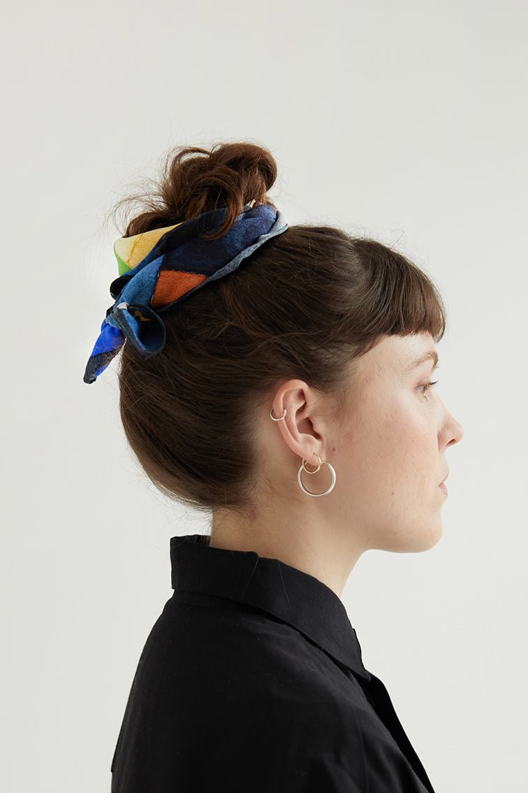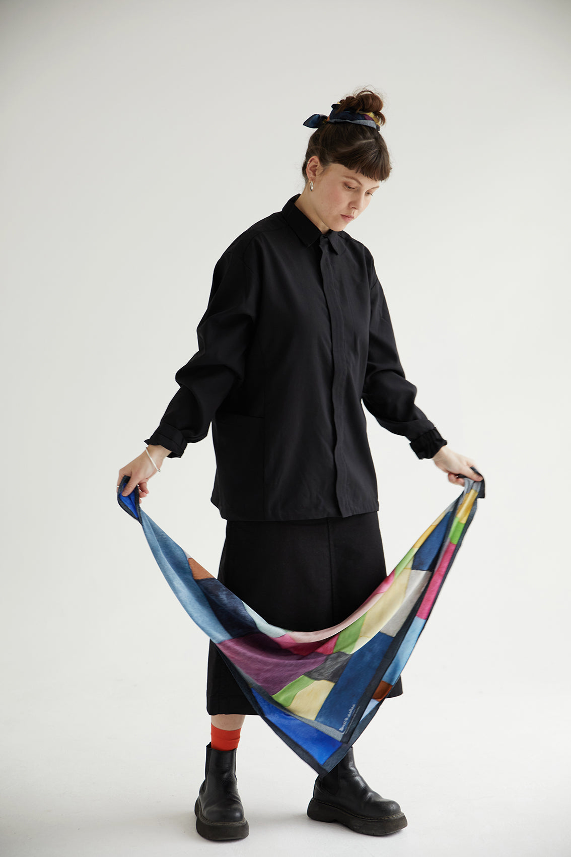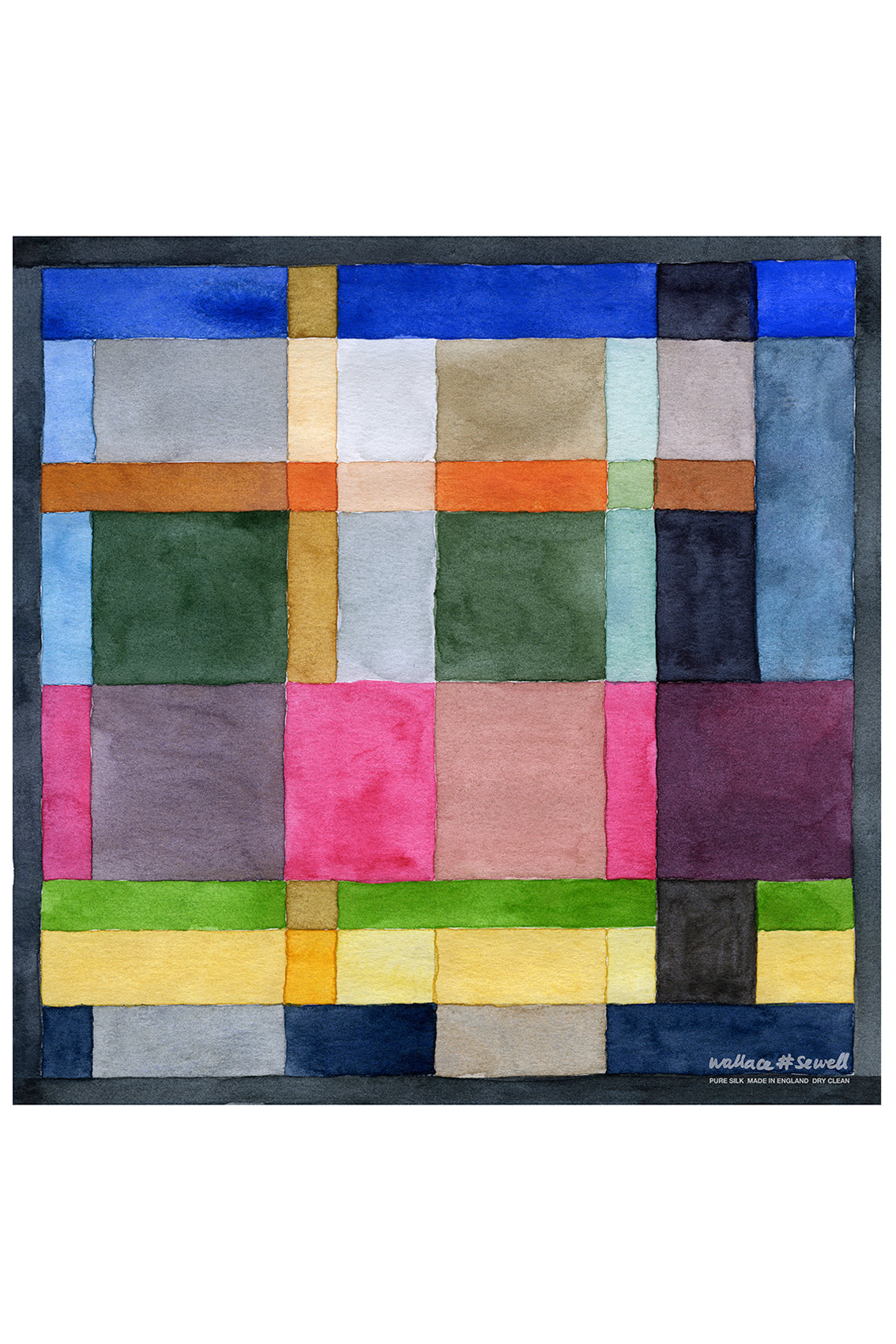 This scarf features a vibrant grid of geometric blocks in a bold and playful mix of colours. Deep blues, bold pinks, rich greens, and pops of citrus yellow and orange create a striking composition. The carefully balanced palette, paired with the structured design, offers a modern yet timeless design.
