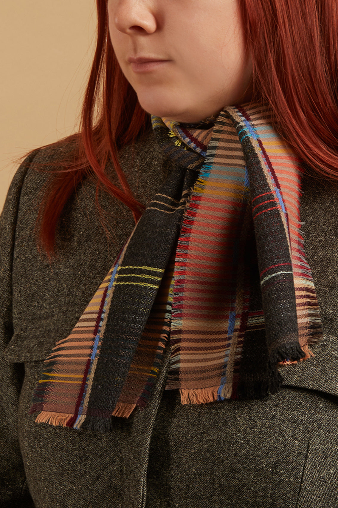 Dafne is a bold, block-coloured short scarf, interplaying with the multicoloured stripes of the warp and finished with a trio of complementary hues that pop at the borders.