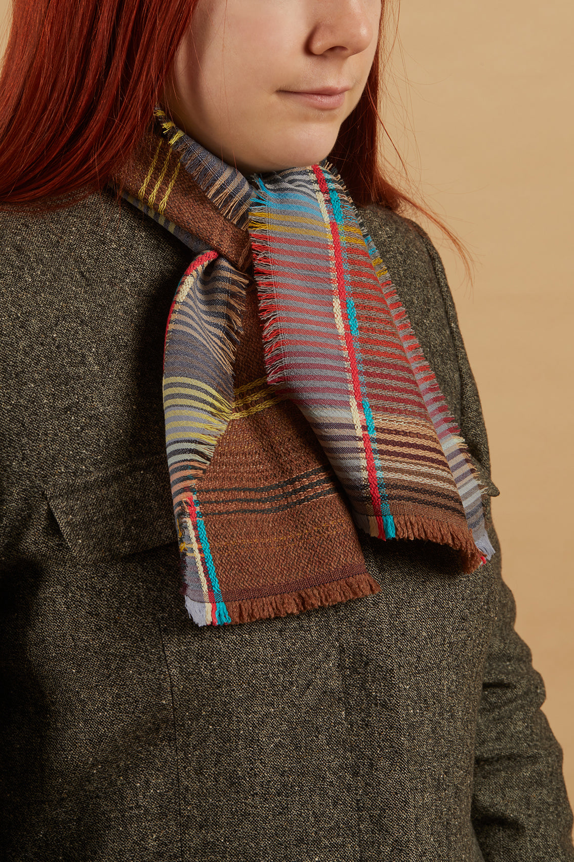 Dafne is a bold, block-coloured short scarf, interplaying with the multicoloured stripes of the warp and finished with a trio of complementary hues that pop at the borders.