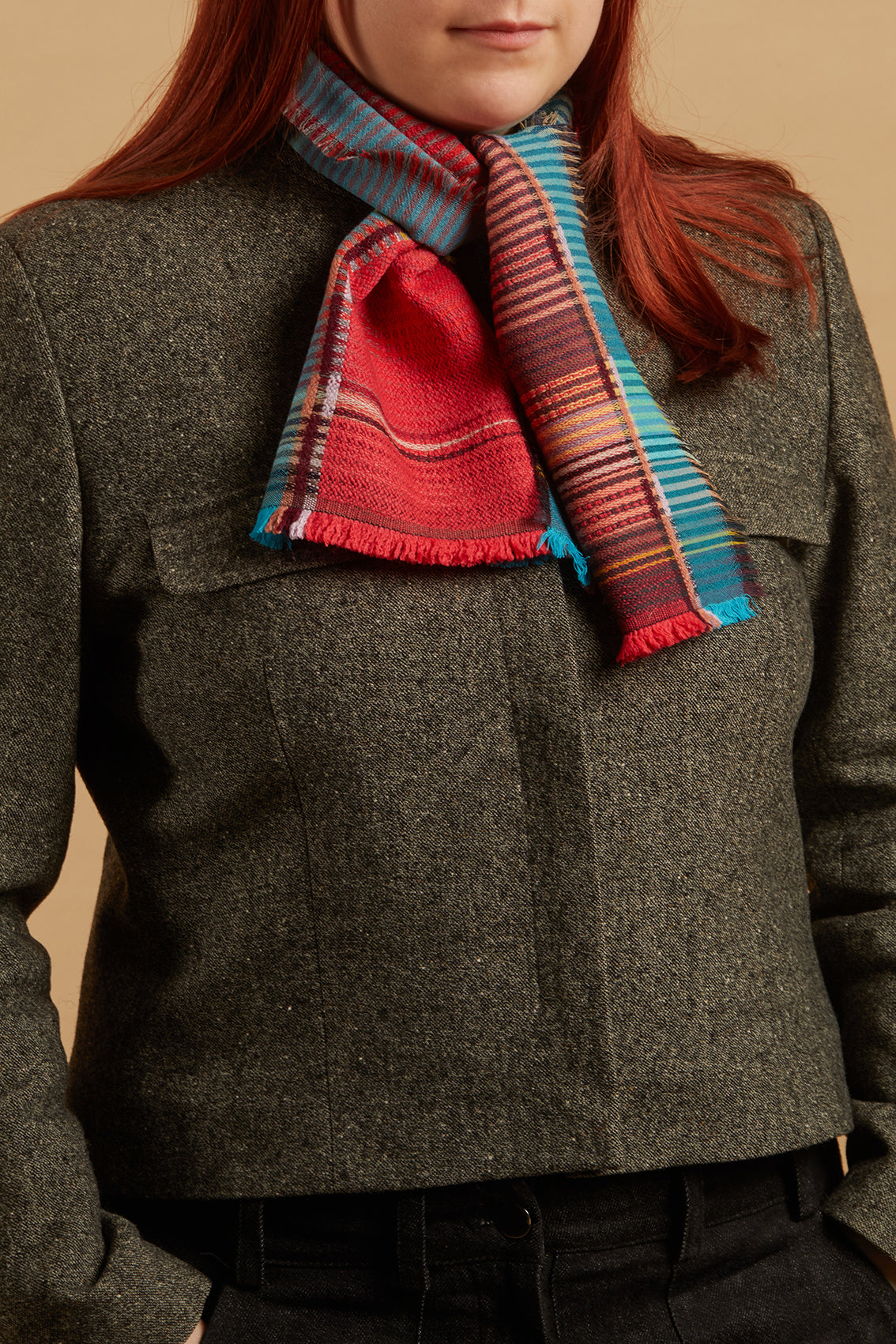 Dafne is a bold, block-coloured short scarf, interplaying with the multicoloured stripes of the warp and finished with a trio of complementary hues that pop at the borders.