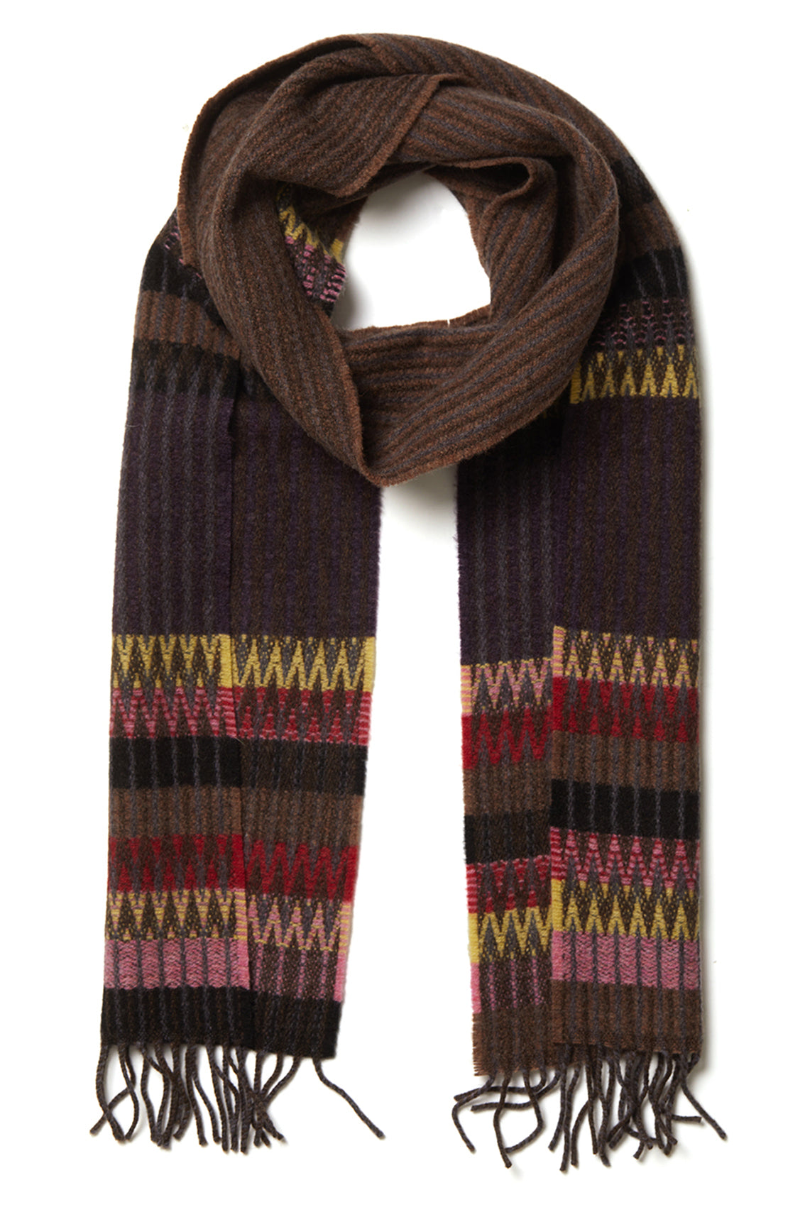 This earthy scarf, with contrasting zigzags in fresh pink and yellow, and a textured border in deep tones of black and berry.