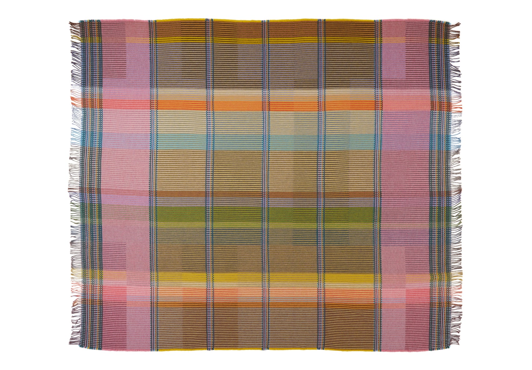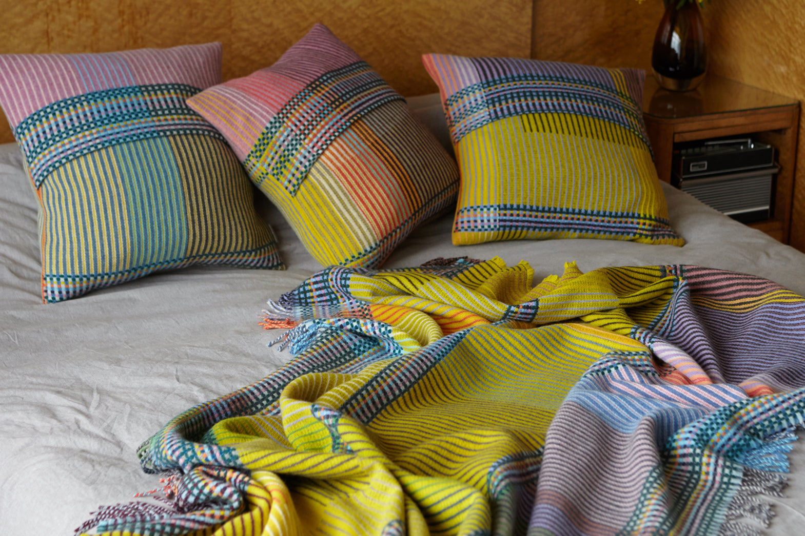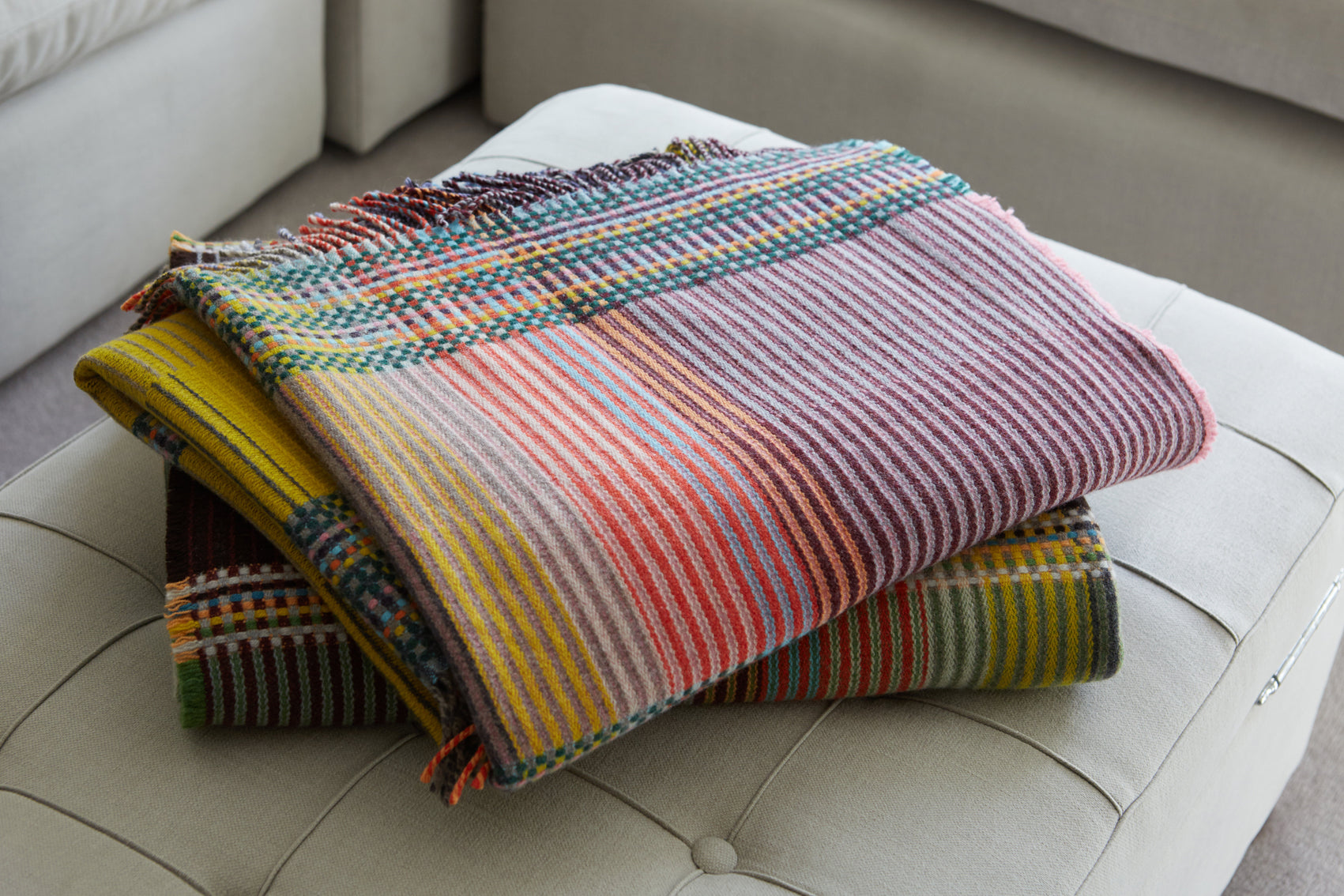 Woven in merino lambswool, our Pinstripe throws combine bold coloured blocks with fine, detailed vertical stripes. This double-sided design also has a contrasting pixelated border and makes a stunning addition to a room.