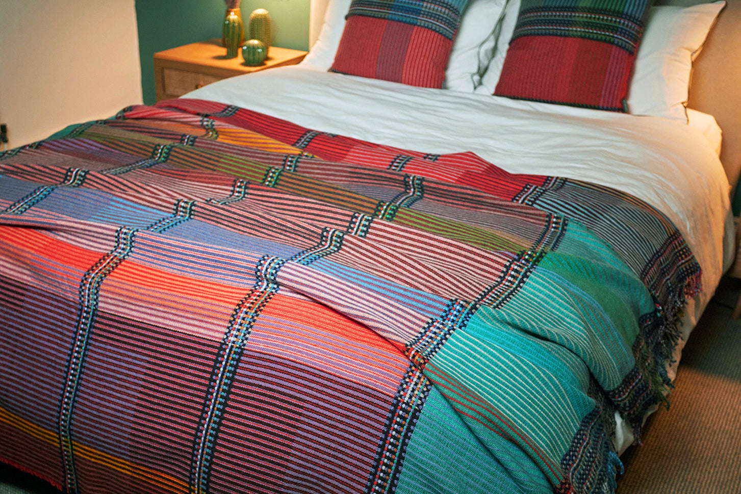 Ida features a bold fiery orange offset with a strong teal in this eye-catching throw, with deeper blueberry tones throughout the intricate striped sections.