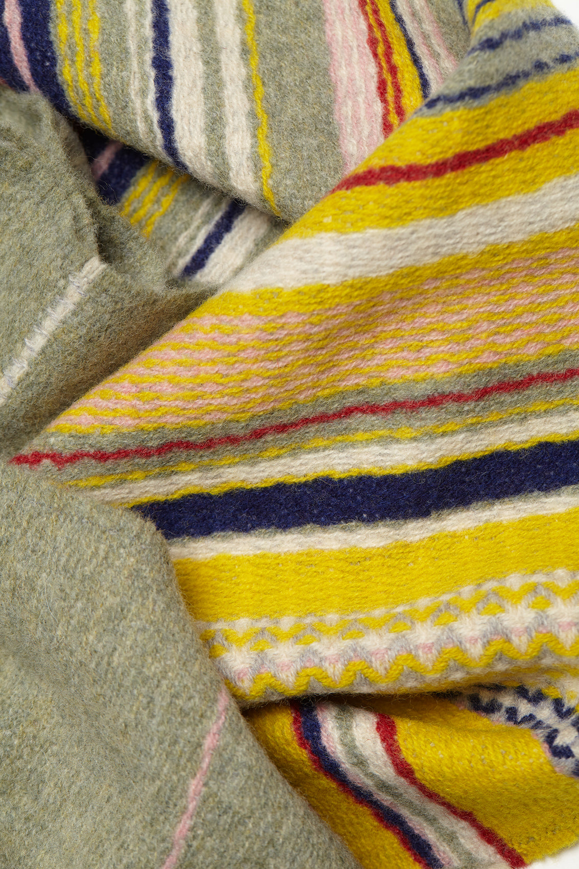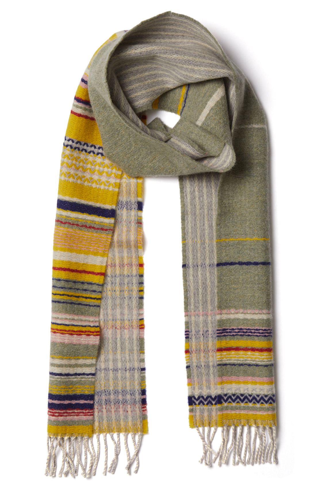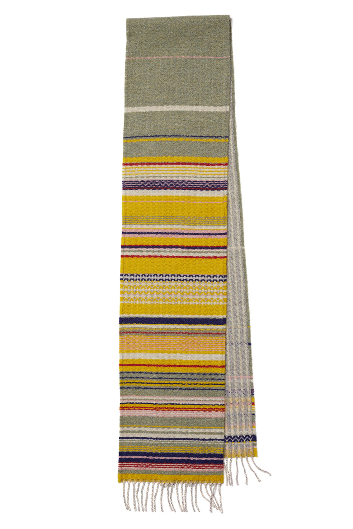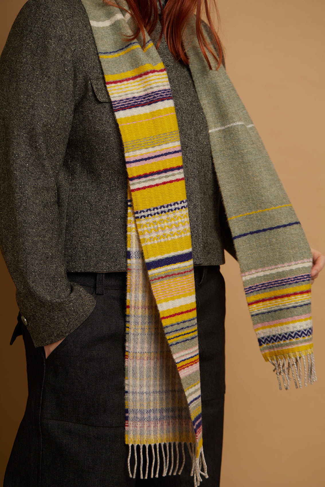 Orchard green and sunny yellow form the bulk to the scarf, with calming details in soft pink, linen, and pomegranate which are lined by edges of contrasting oxford blue.