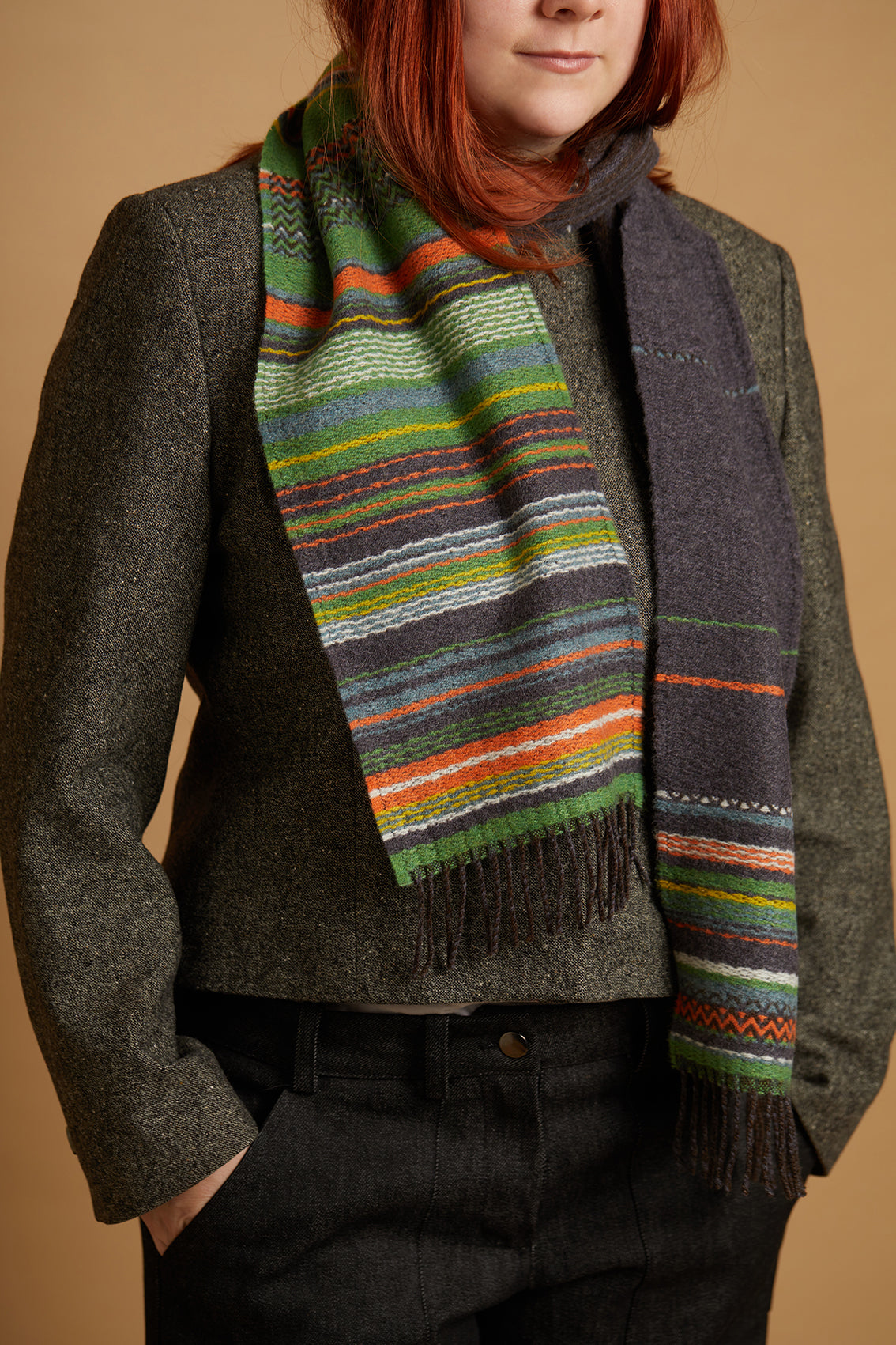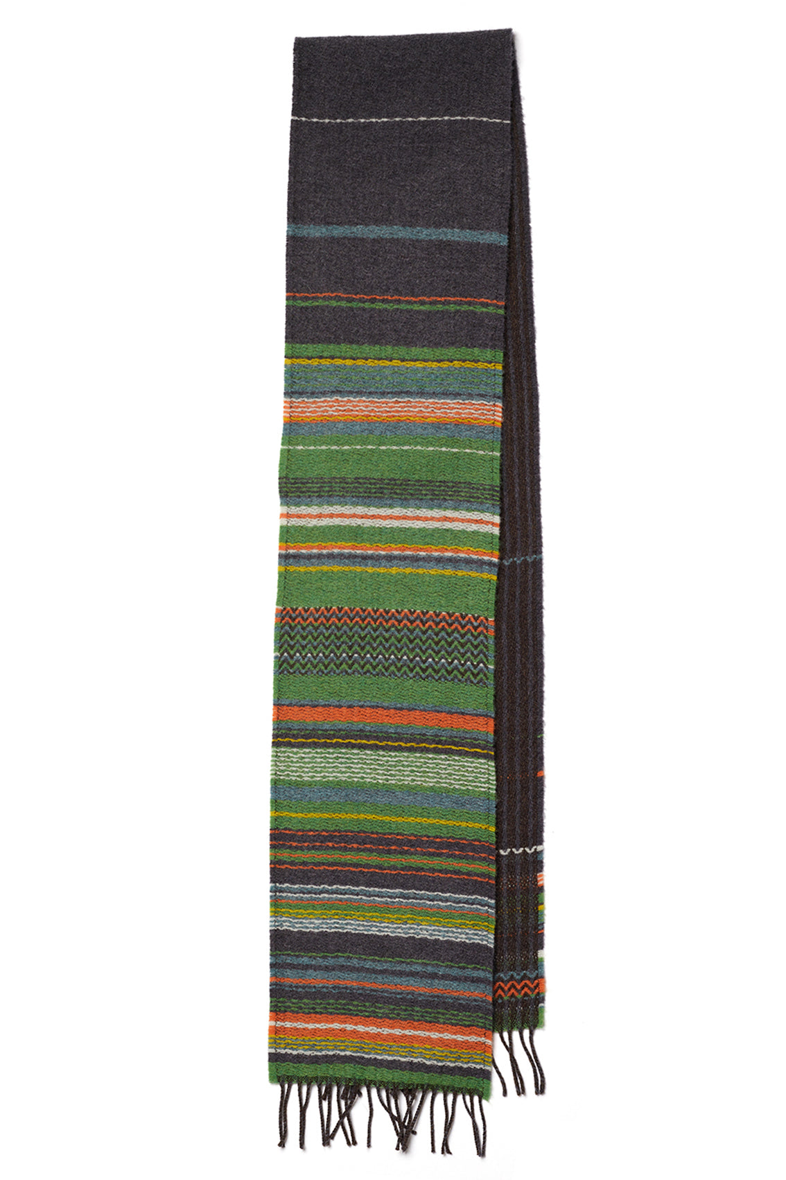 A fun, asymmetric design featuring one side of condensed stripe, which dissipates throughout the middle before gathering again at the other end of the scarf.