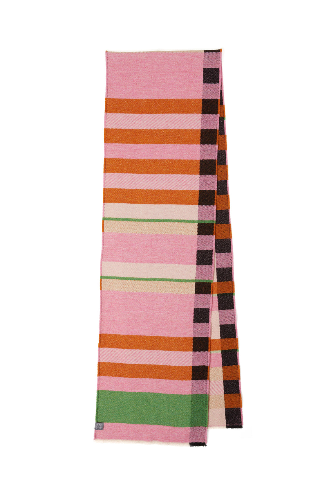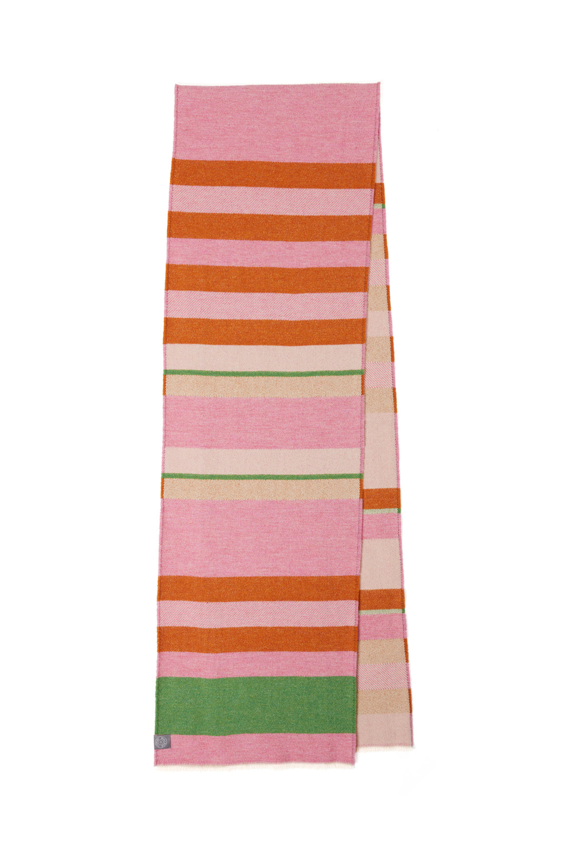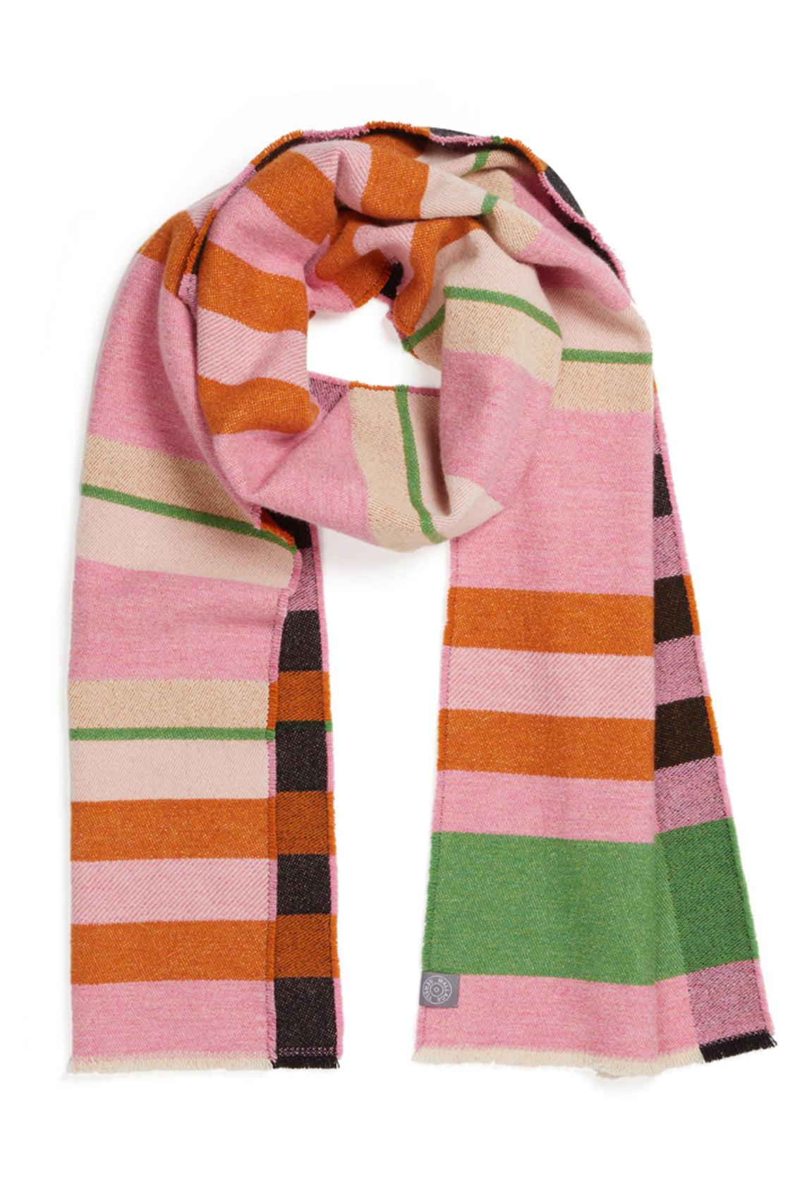 The Nougat wrap is candy pink matched with ochre hues and grass green against a cream background, influenced by Paul Klee’s painting ‘Scenecio’.