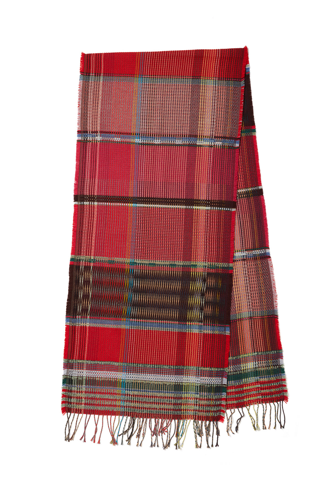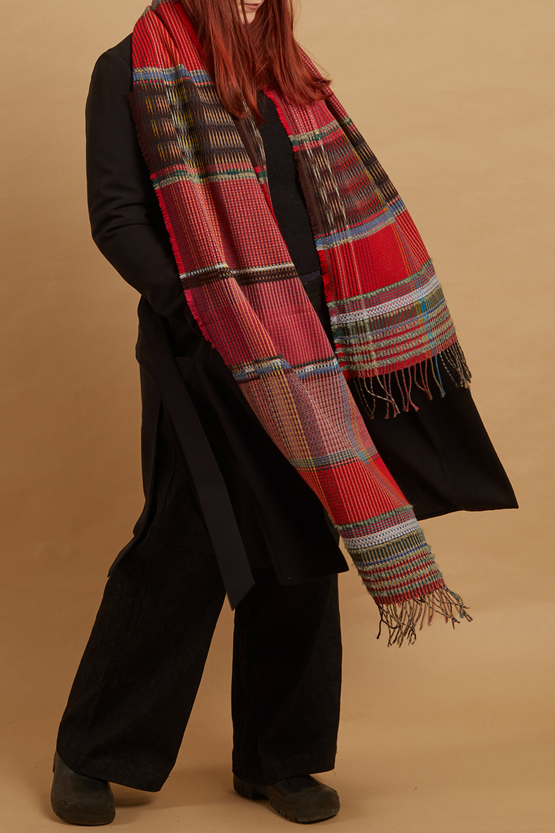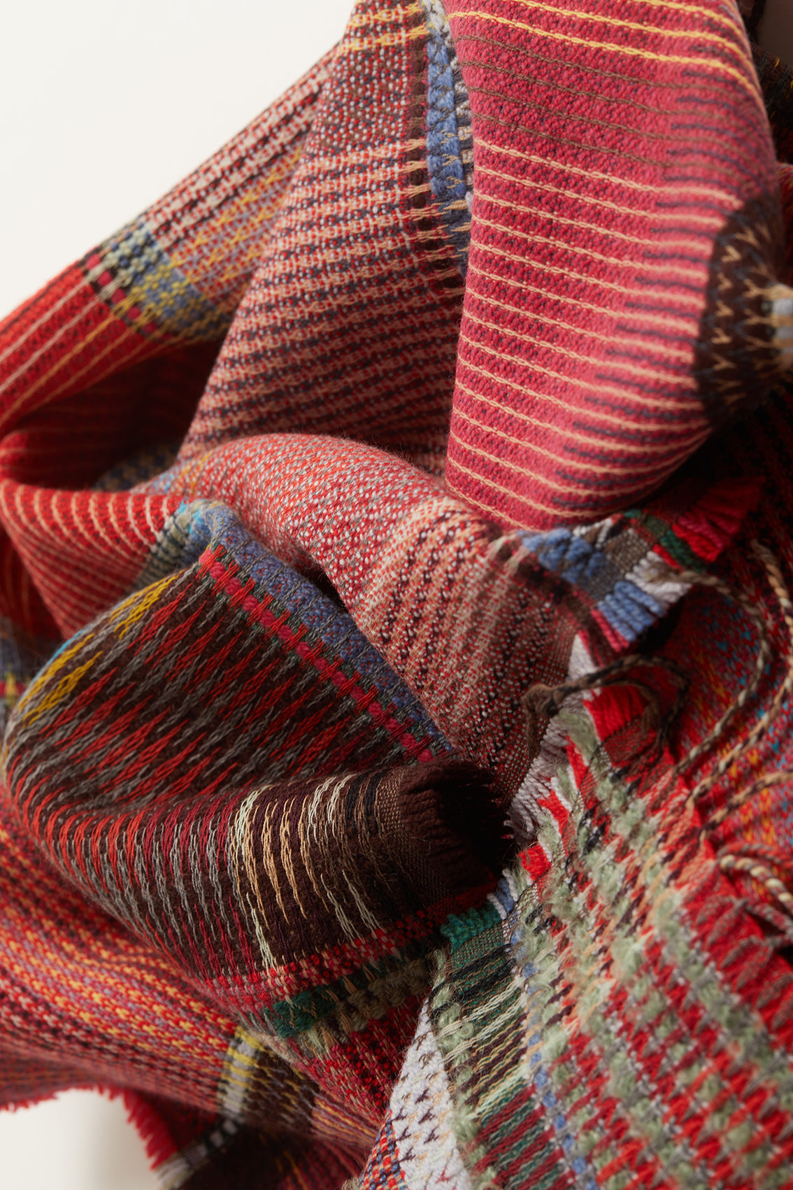 The Ortensia Wrap is woven in fine lambswool with a soft mohair border, combining textured stripes, checks, and grids. Subtle woven patterns in interchanging colours add depth, finished with tassels.