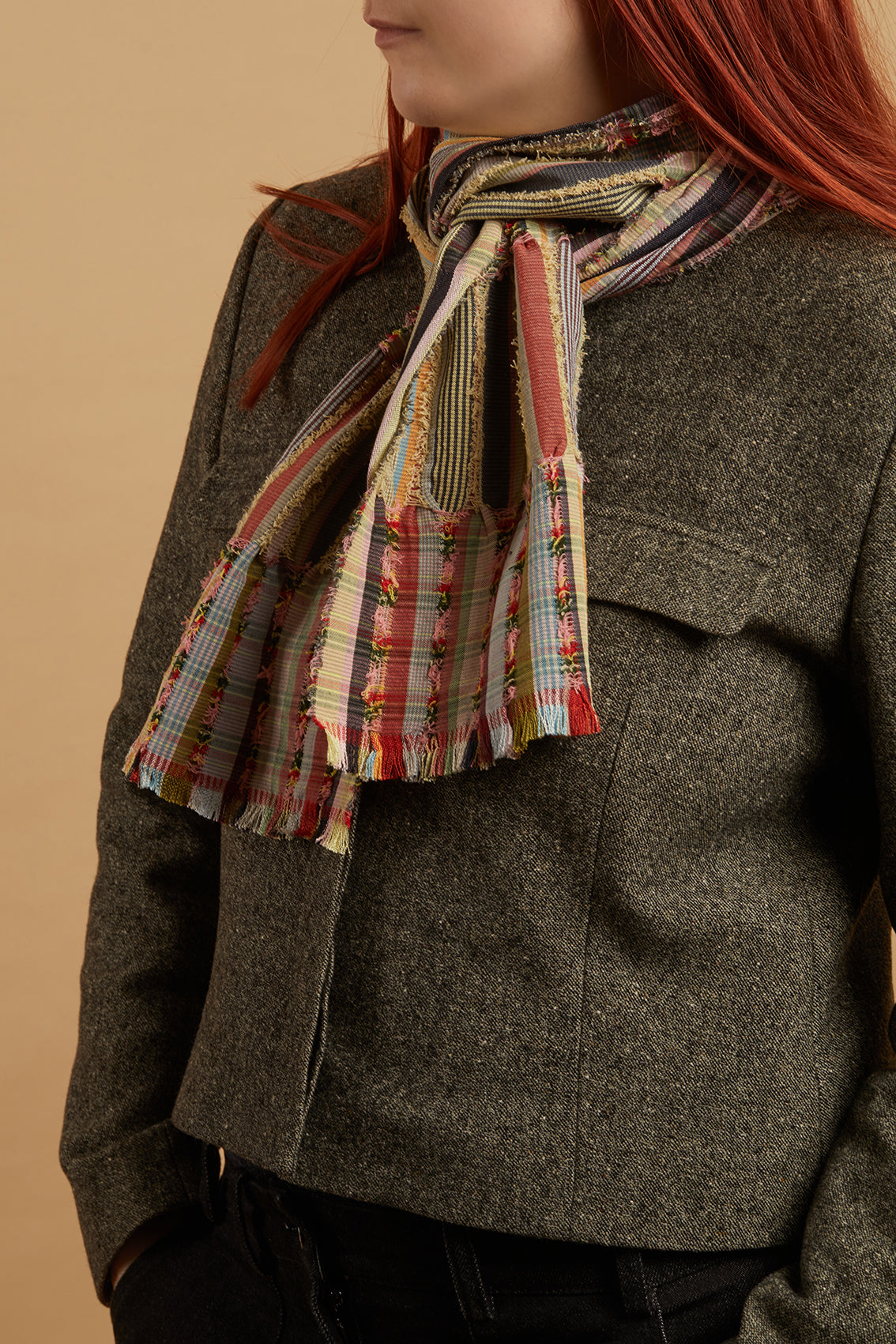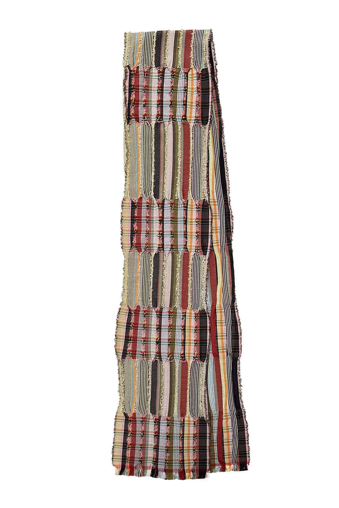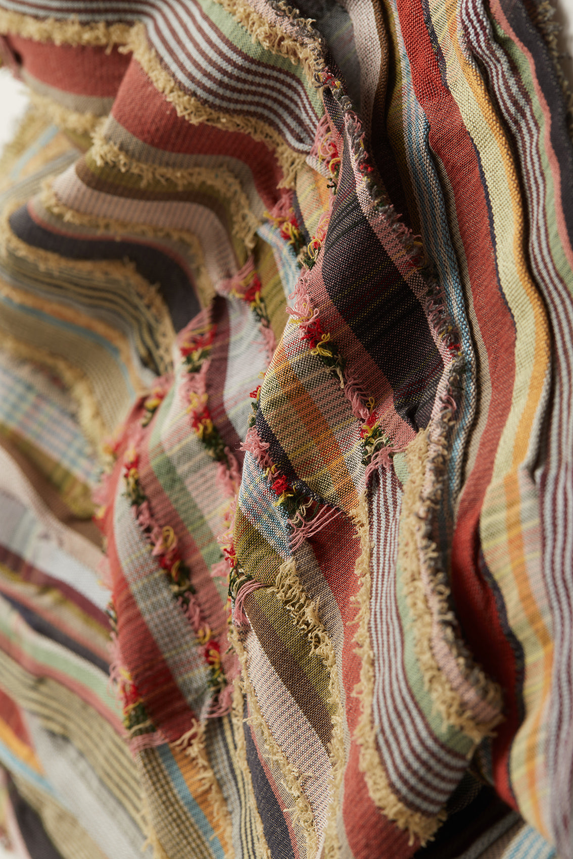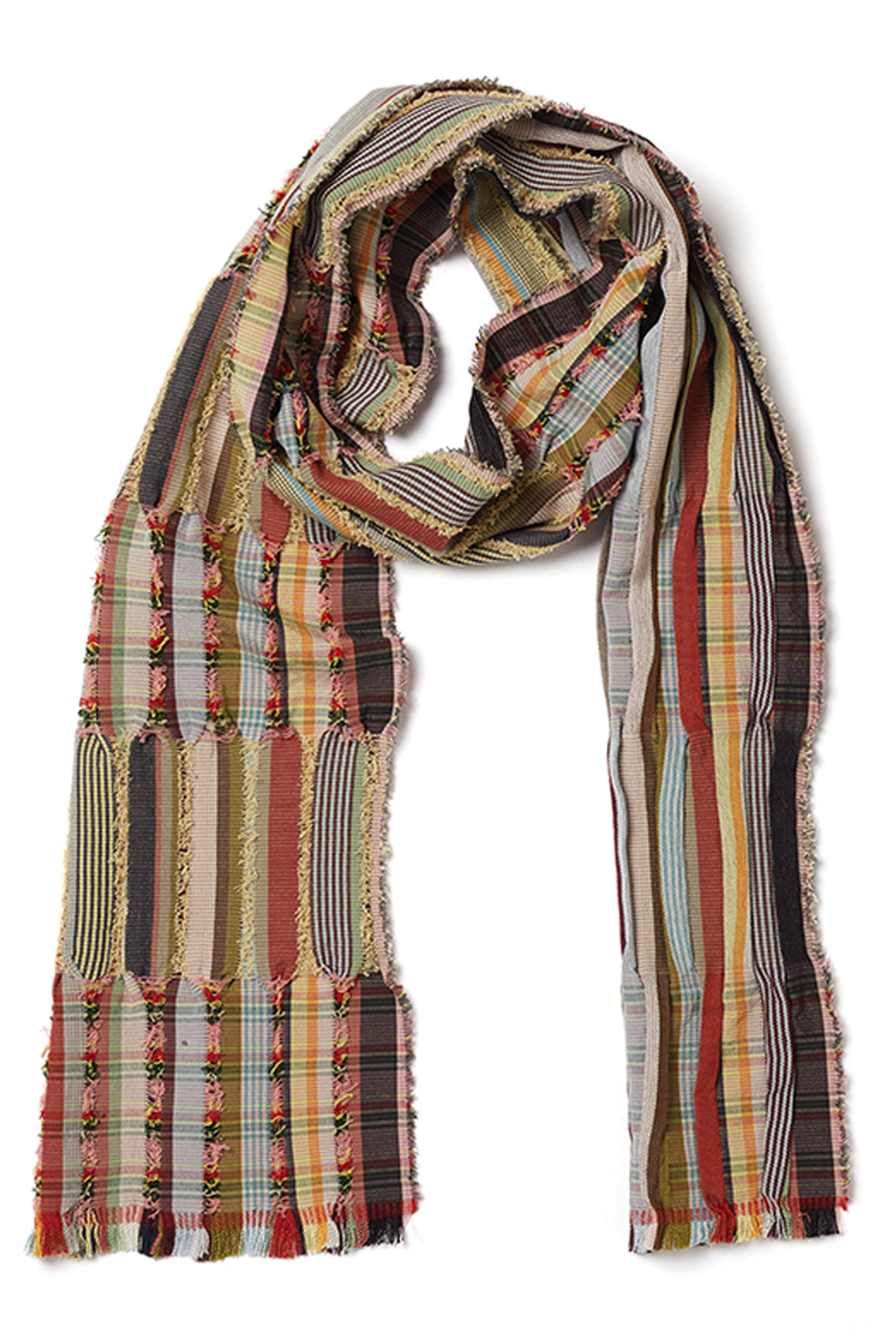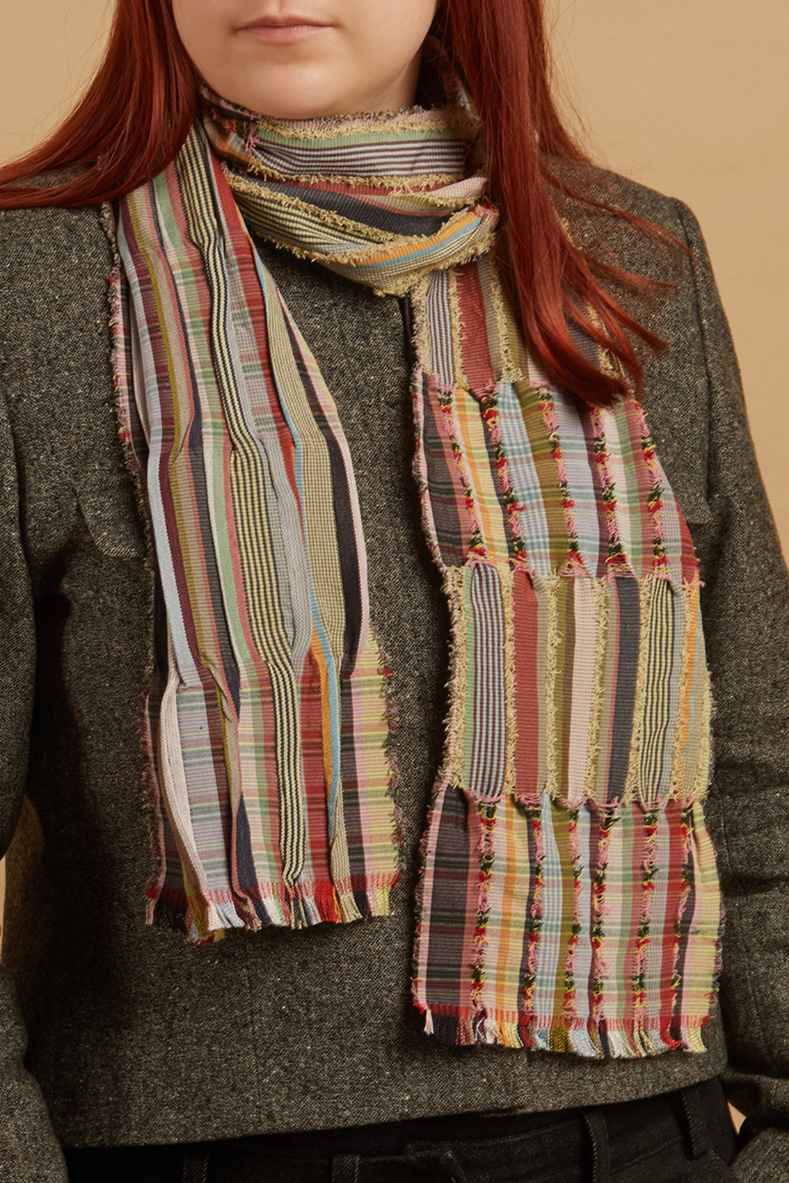 This scarf features a playful blend of buttermilk, grass green, cherry red, and yellow, intermingling throughout the fine stripes and intricate patterns. The vibrant colours enhance the textured design, adding a lively and dynamic element to its overall look.