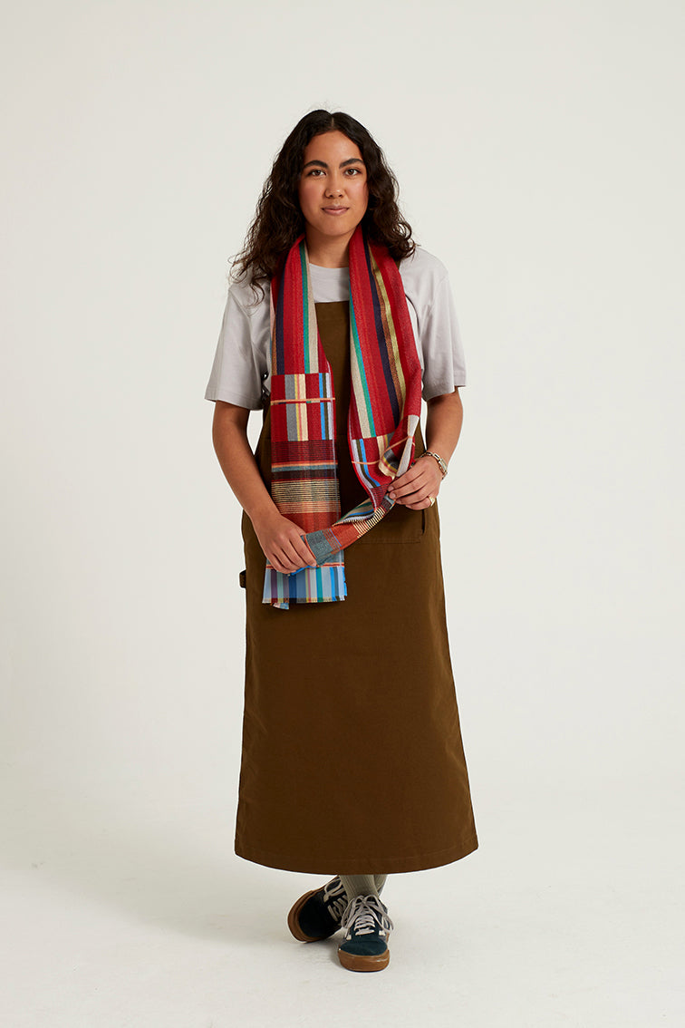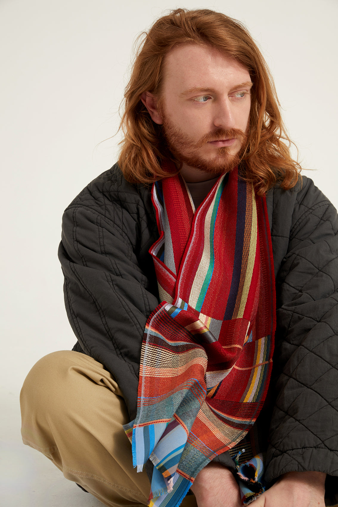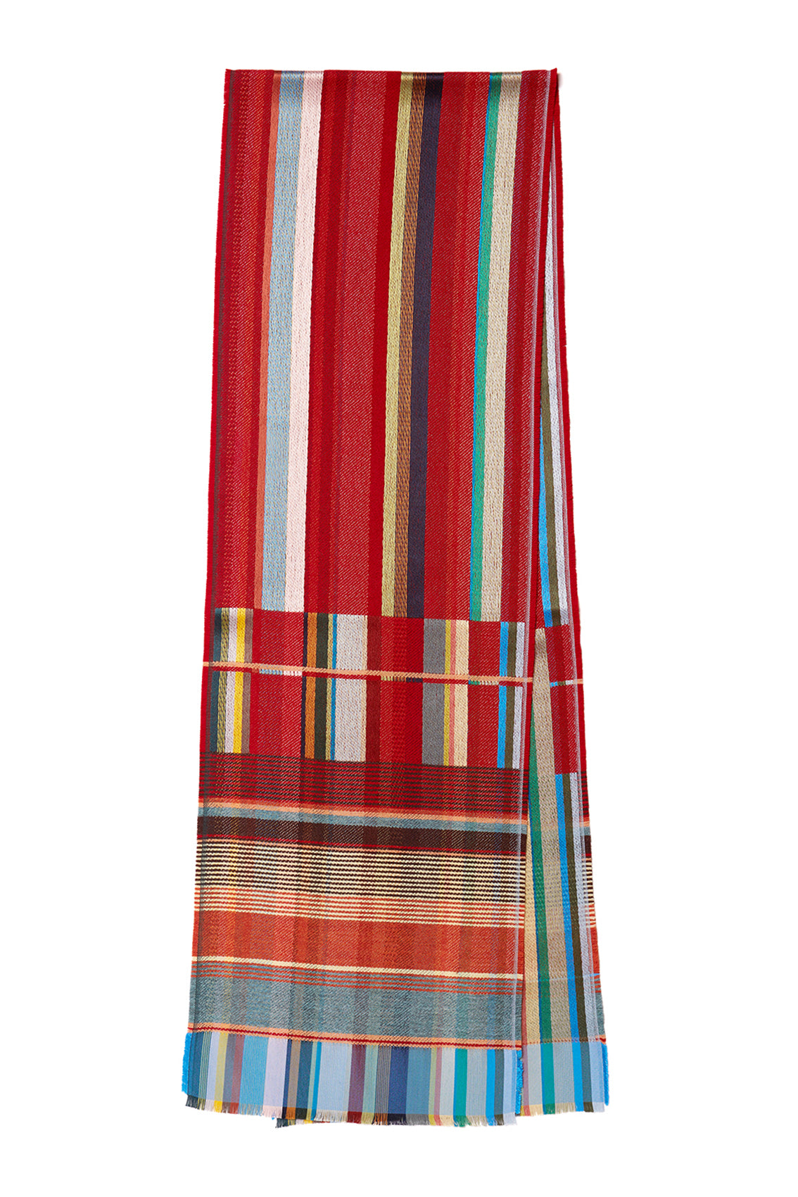 A beautifully soft silk and lambswool woven scarf, showing both warp and weft in bold stripes throughout the body of the scarf, contrasted with a striking border full of delicate stripes of colour.