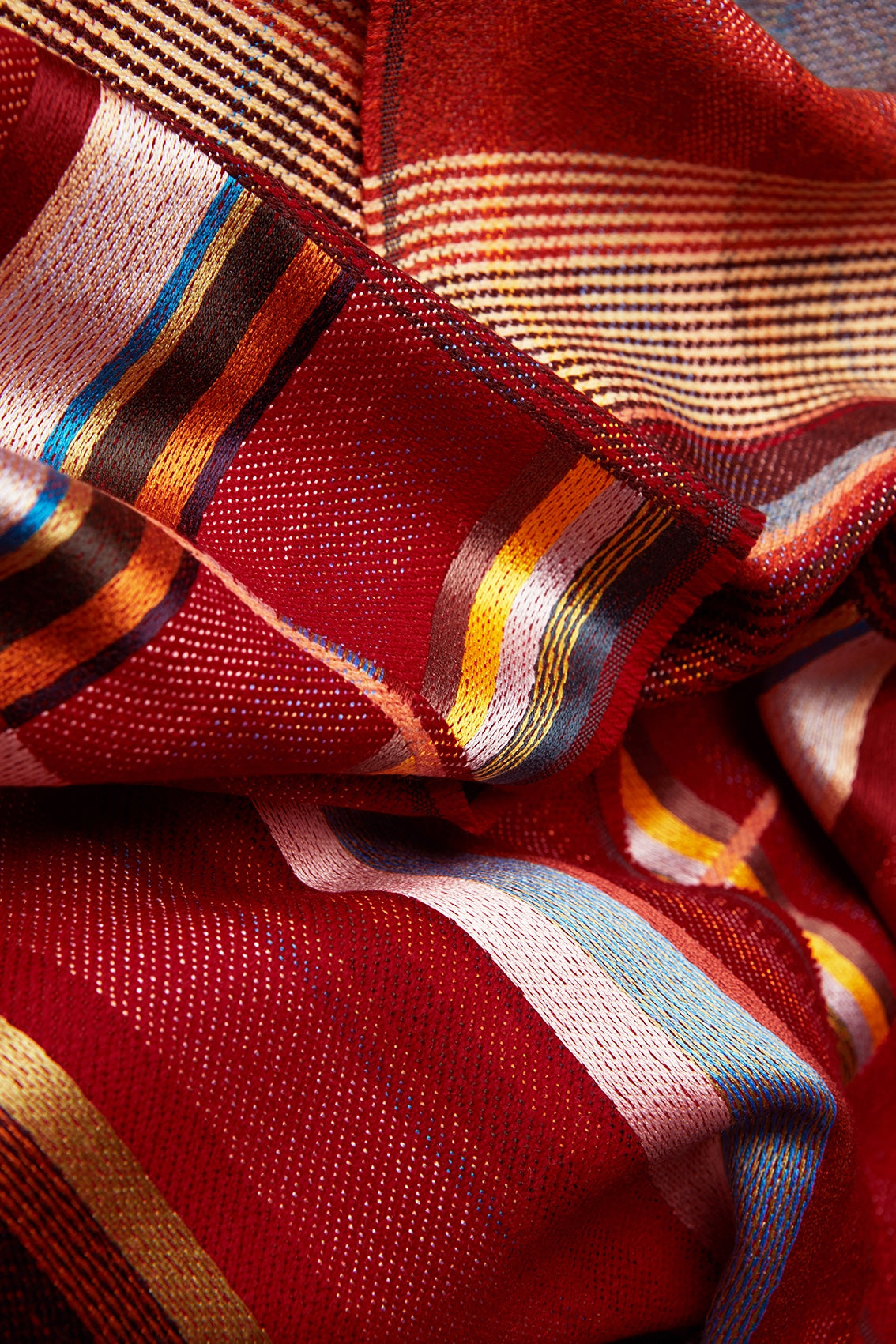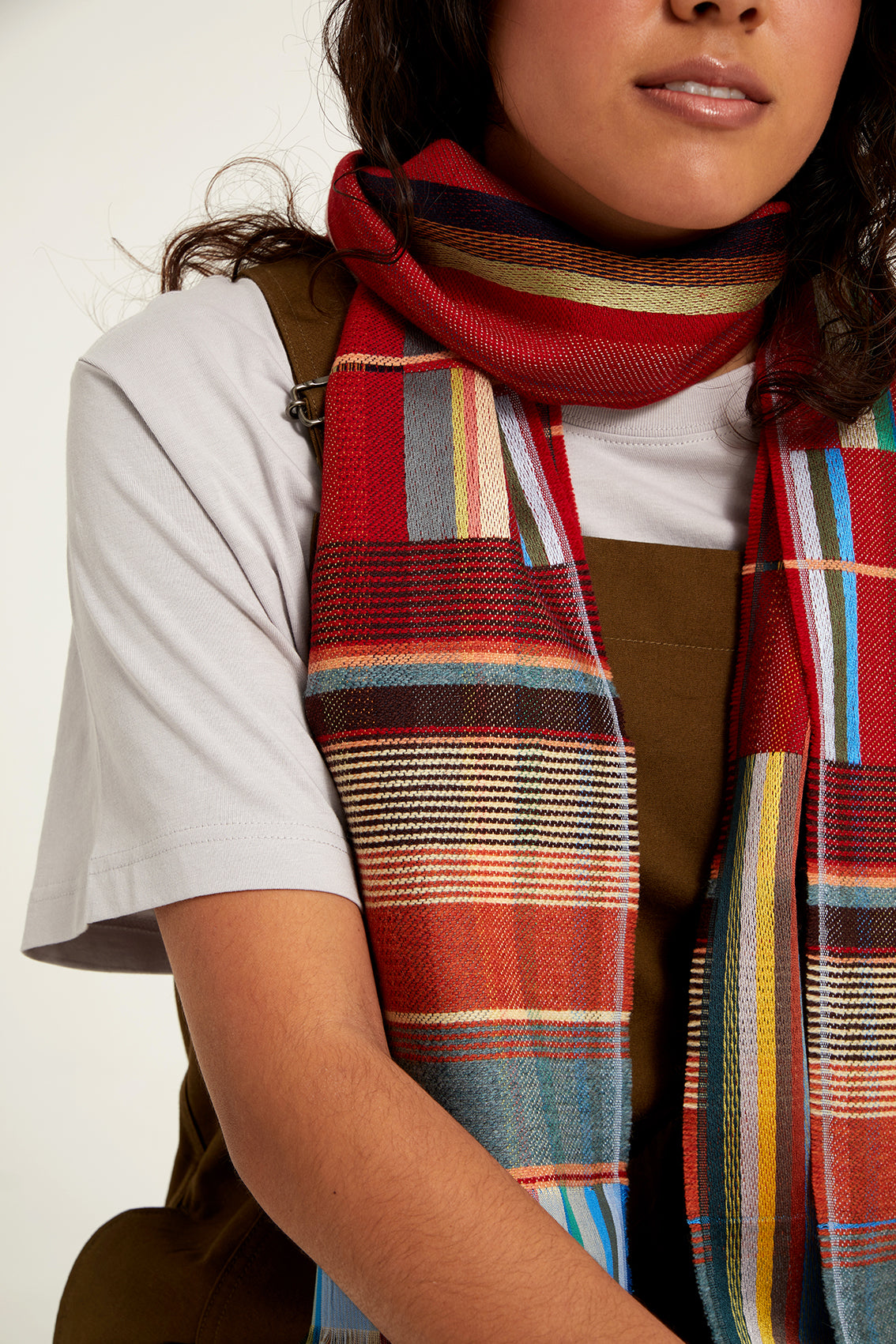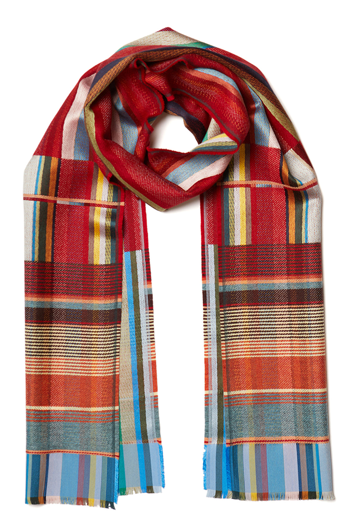 A warm, jammy red scarf complimented by cooler blues and highlights of bright off-white, ending on a vibrant blue silk border.