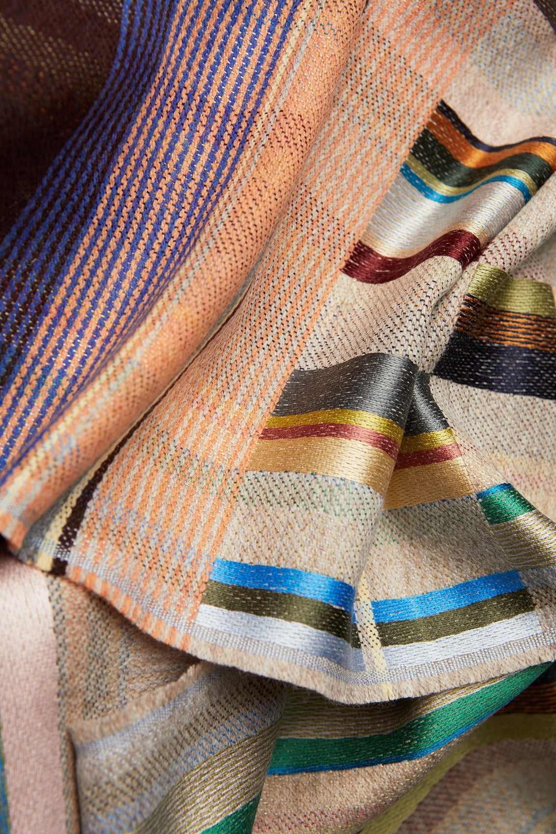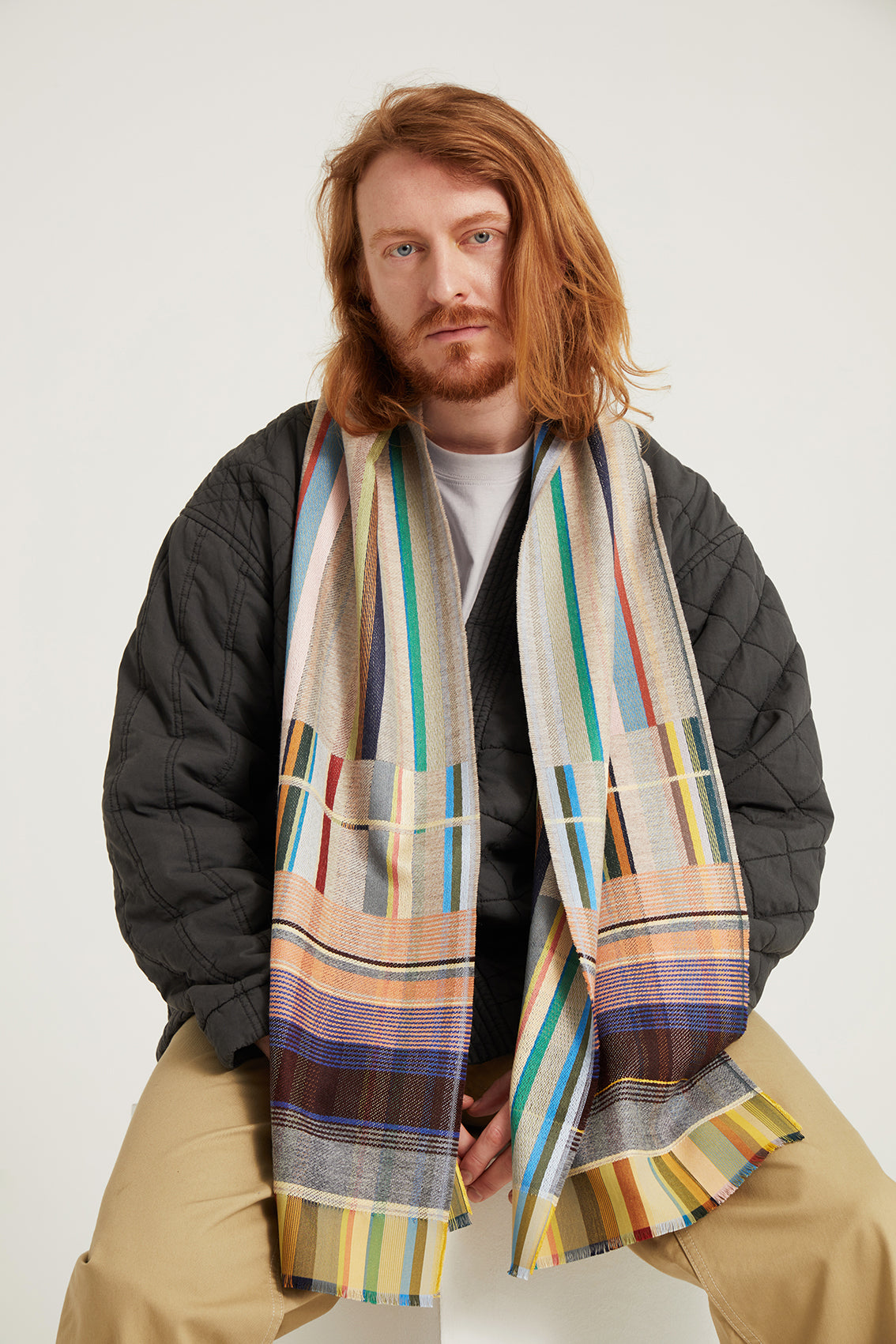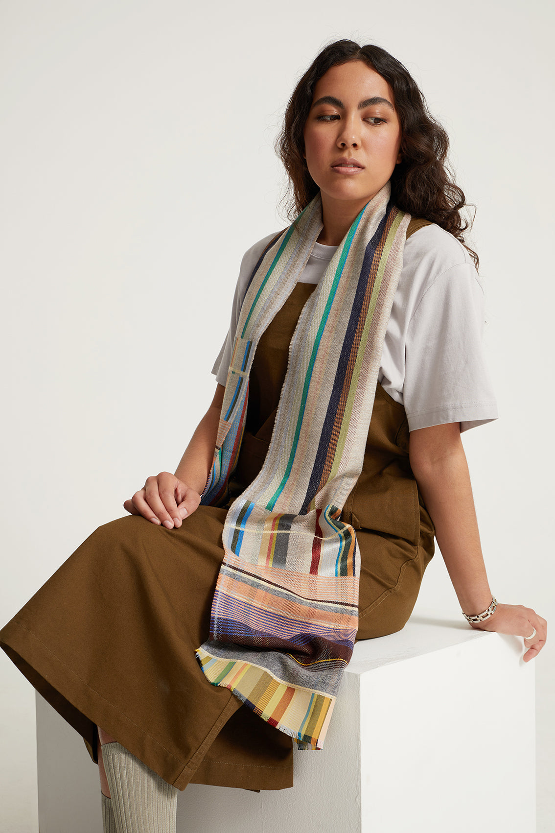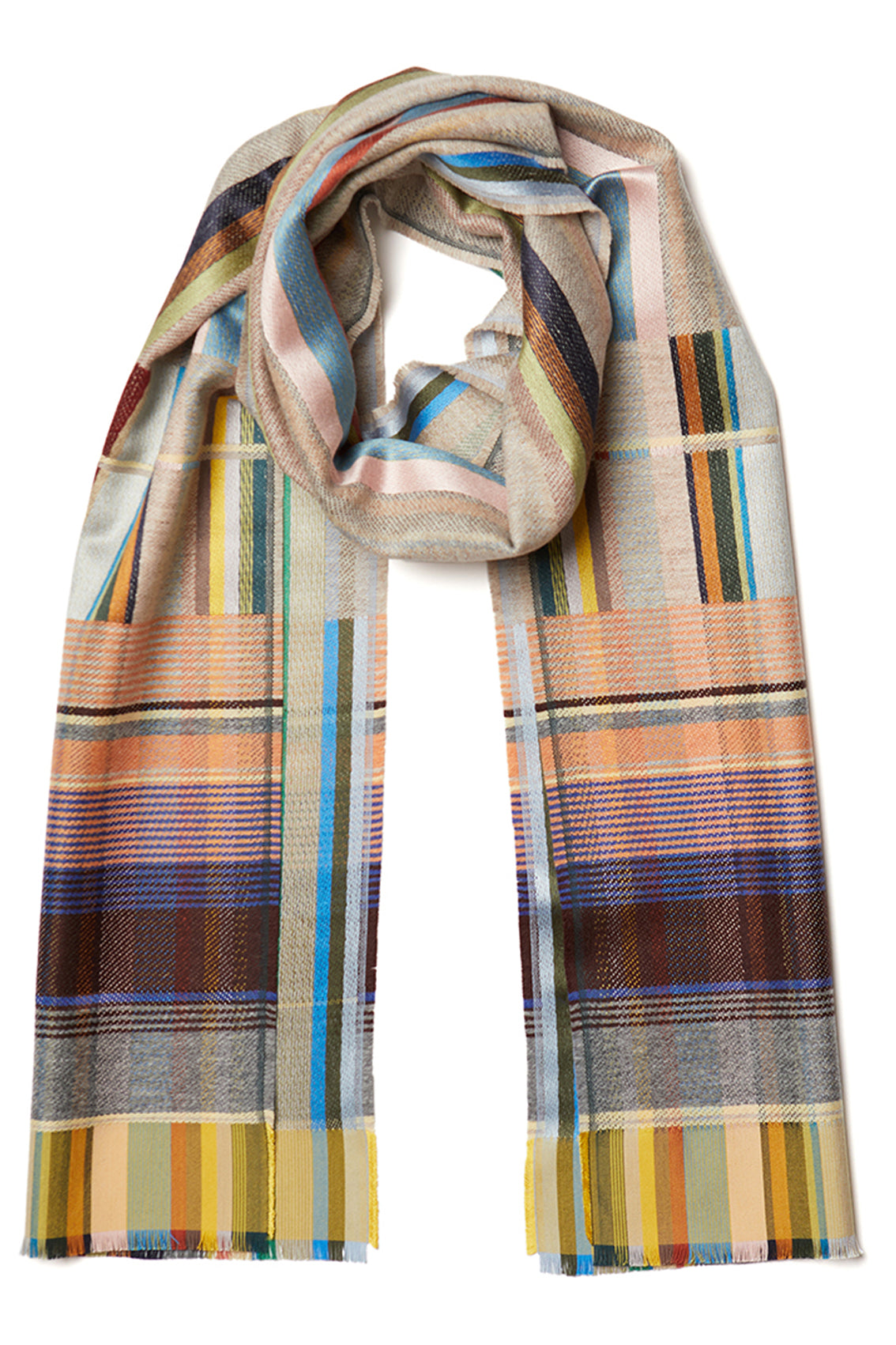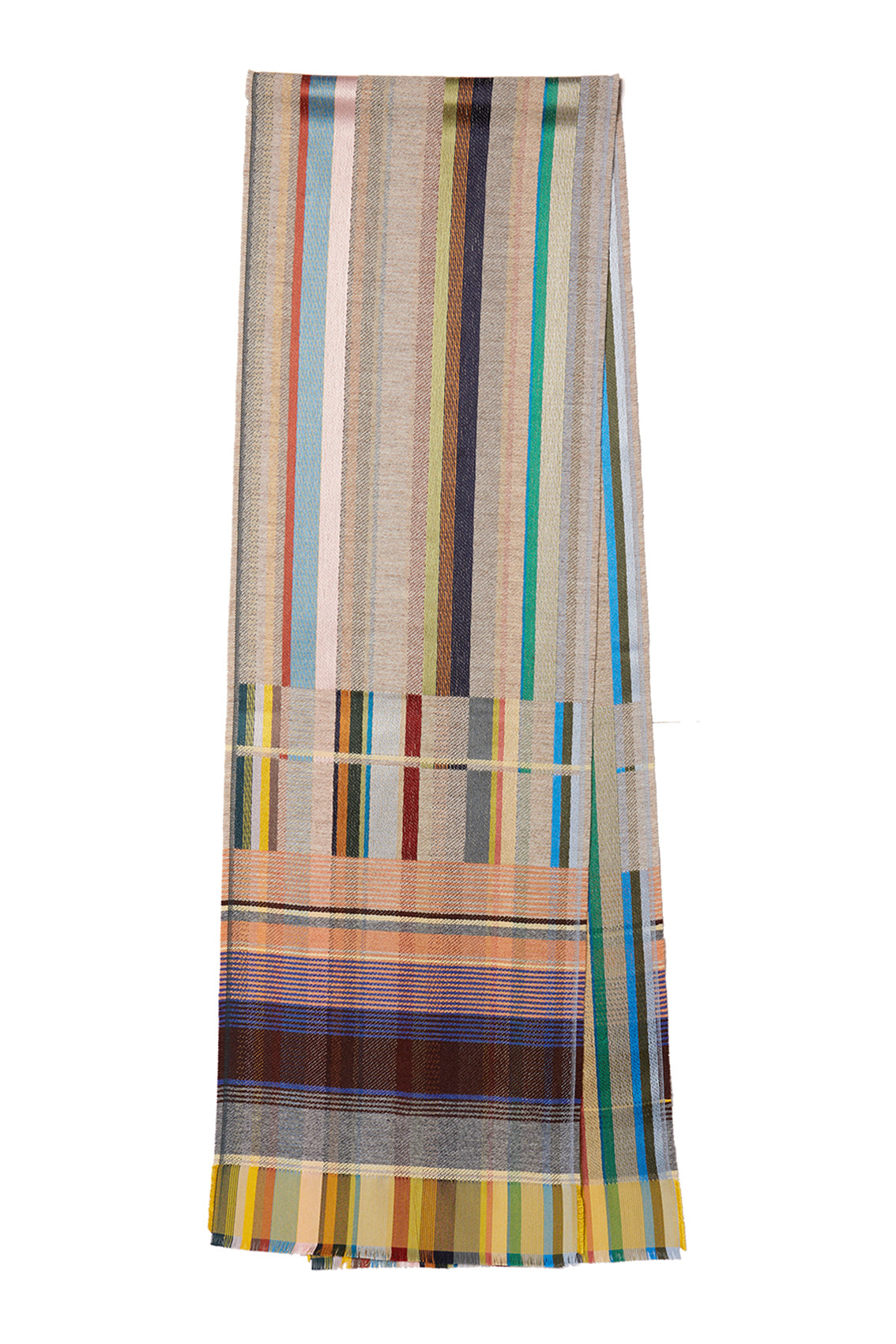 A beautifully soft silk and lambswool woven scarf, showing both warp and weft in bold stripes throughout the body of the scarf, contrasted with a striking border full of delicate stripes of colour.