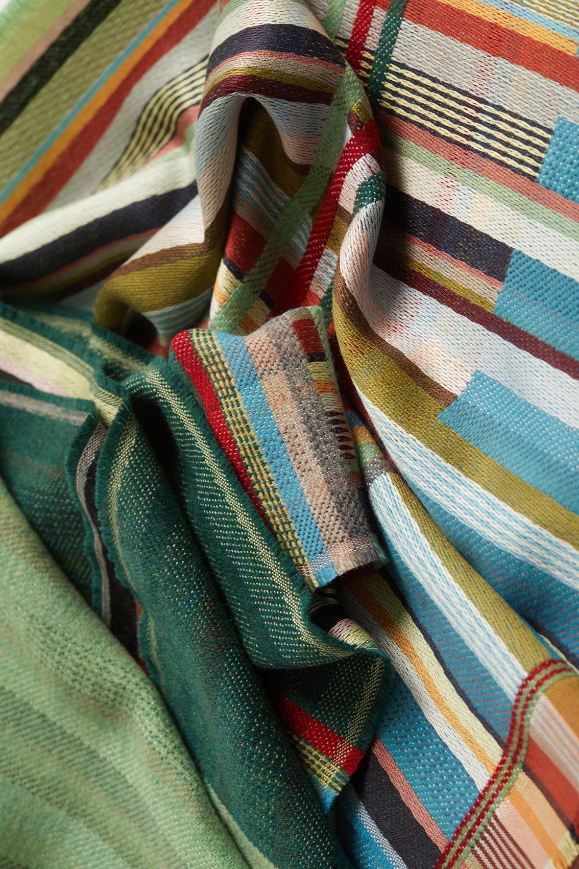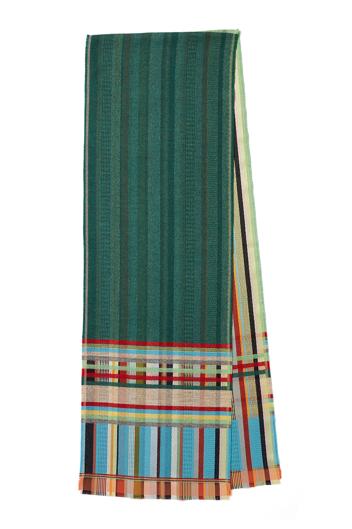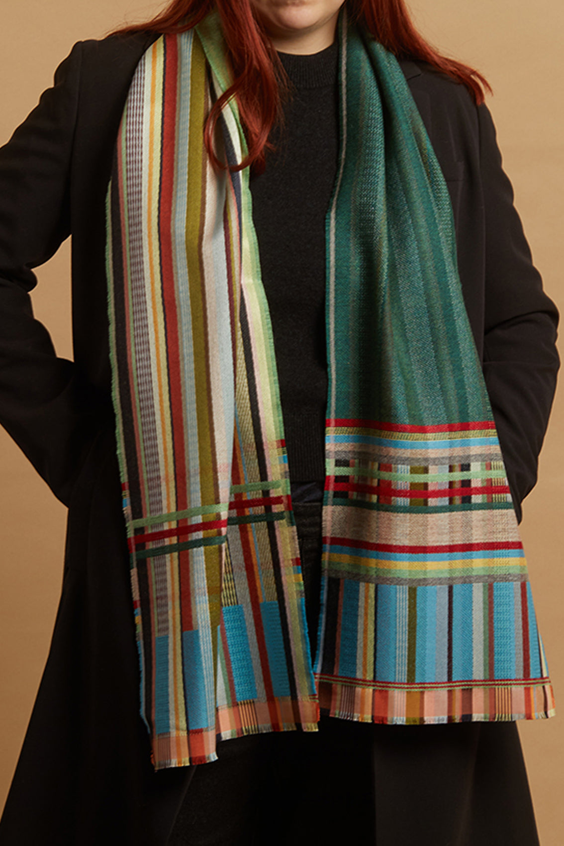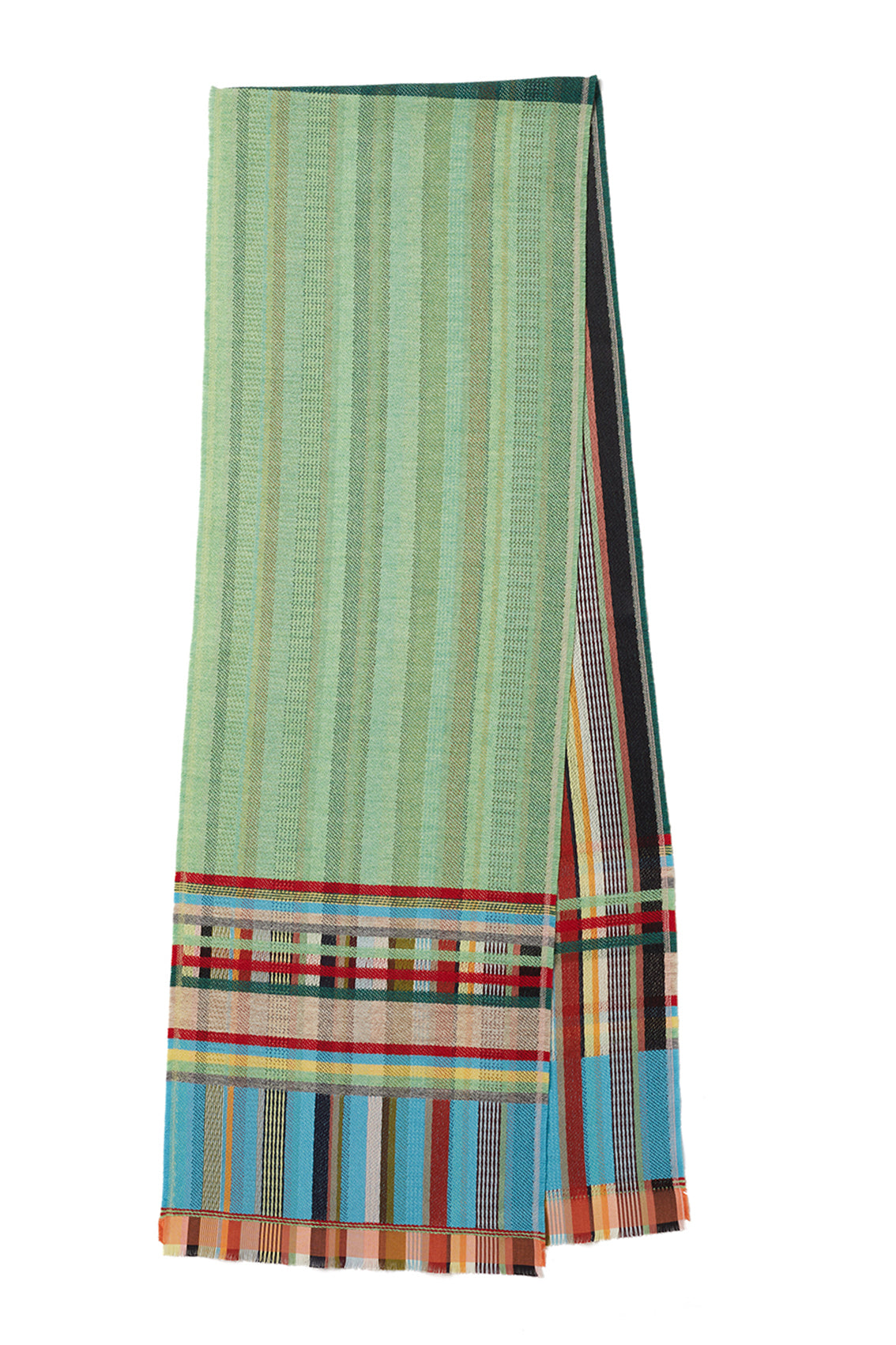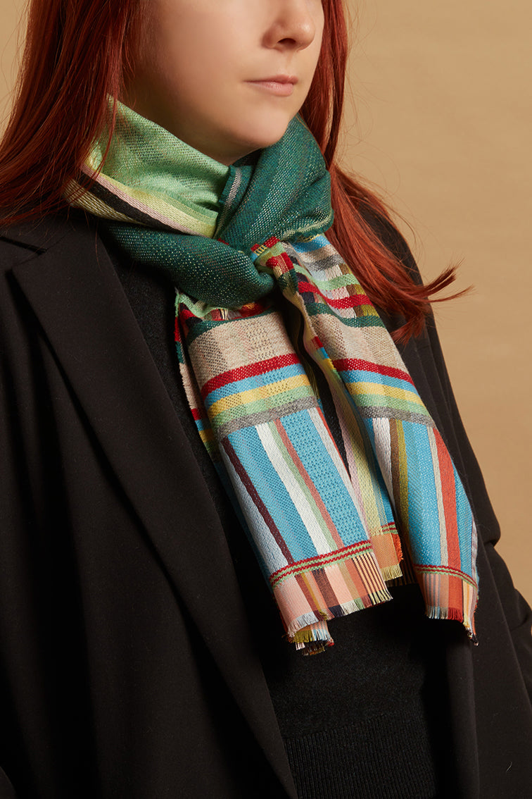 Rosa features a duo of bold lambswool woven on one-side with the silk stripe warp on the other. The border mixes both silk & lambswool in woven blocks and stripes, finished with a neat fringe.
