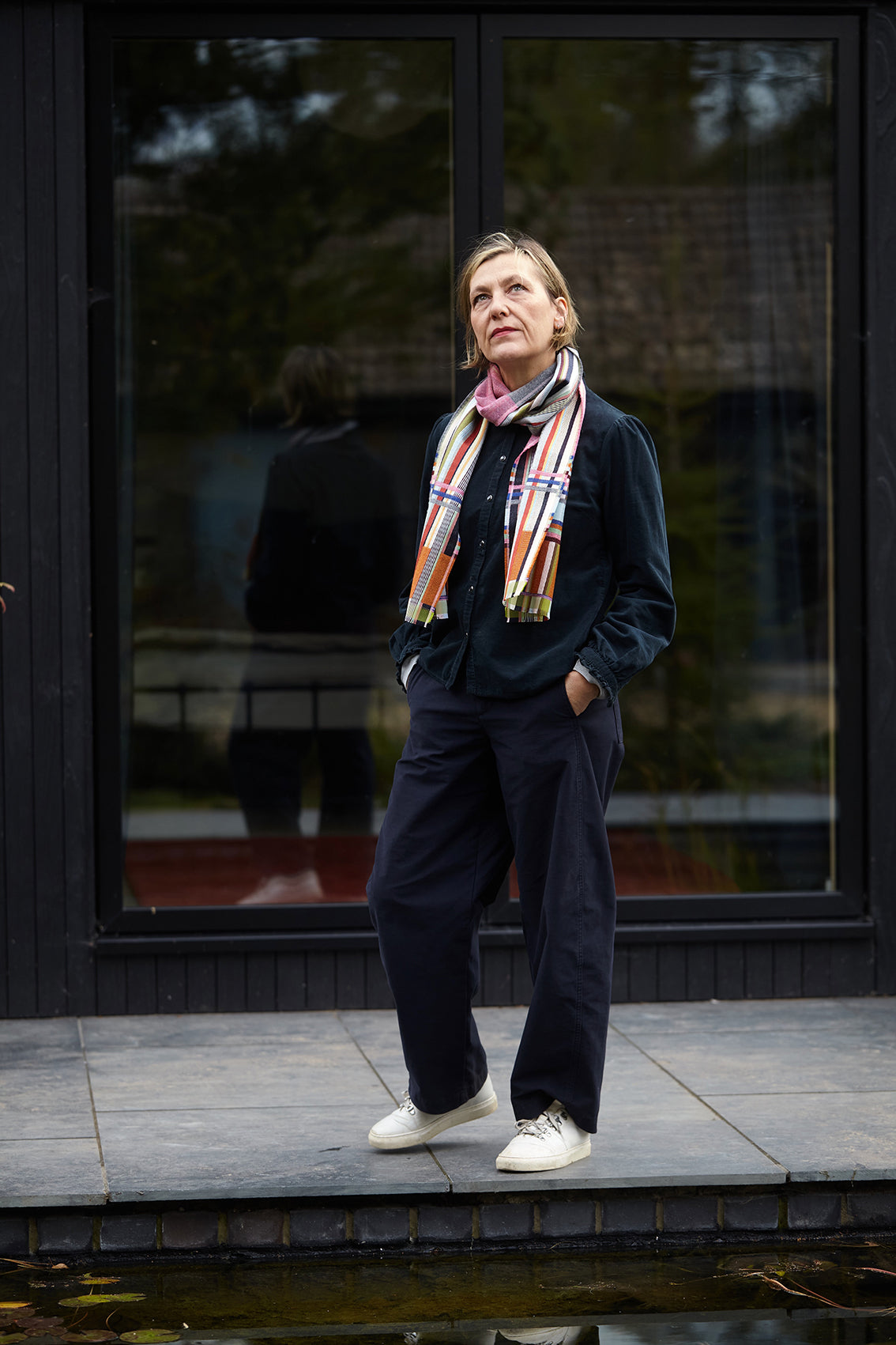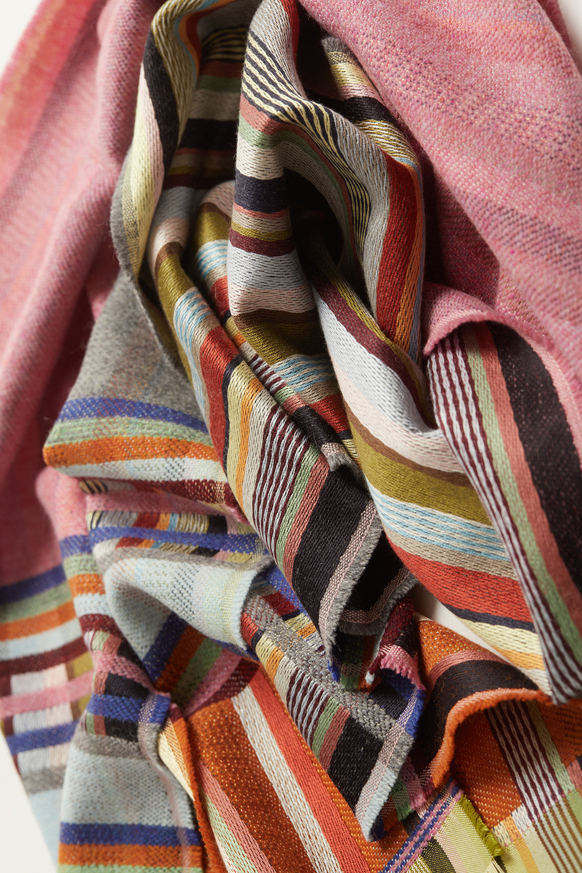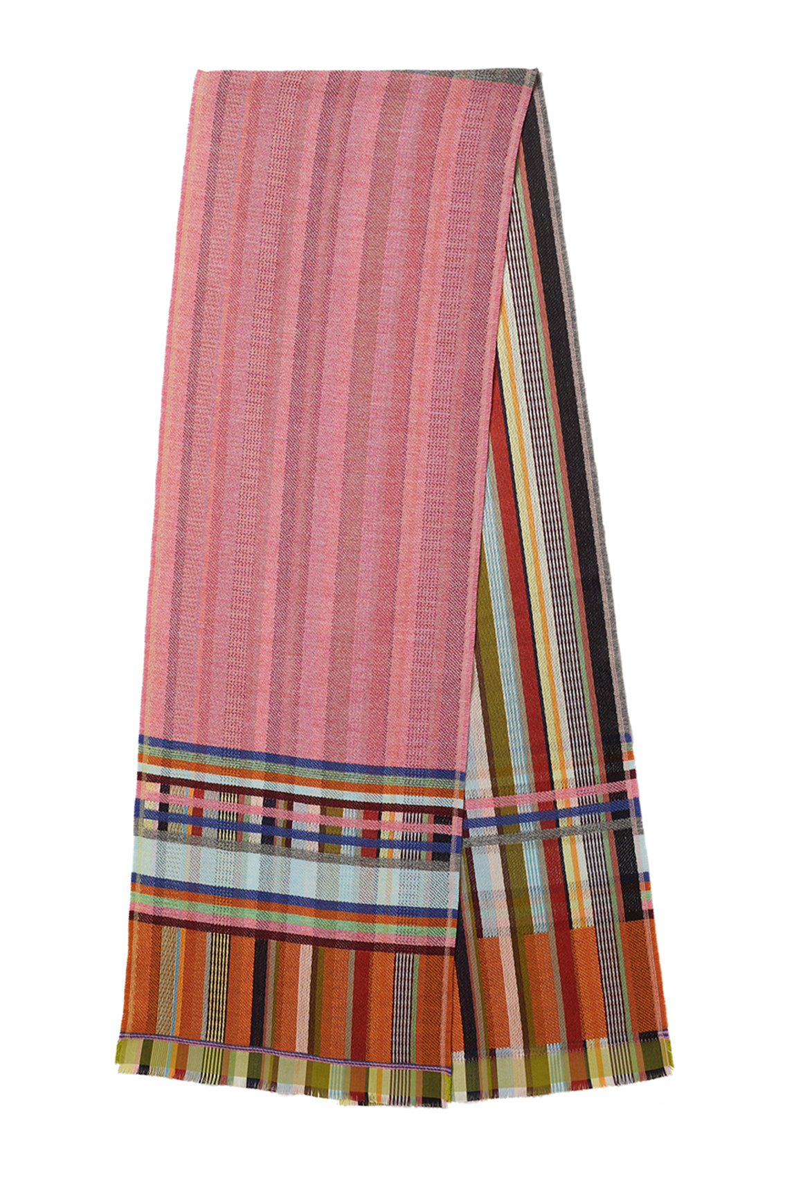 Rosa features a duo of bold lambswool woven on one-side with the silk stripe warp on the other. The border mixes both silk & lambswool in woven blocks and stripes, finished with a neat fringe.