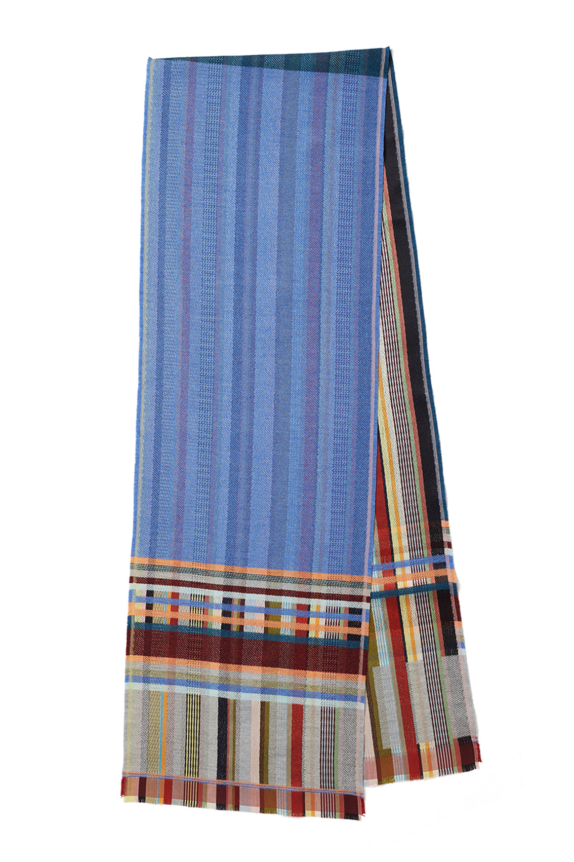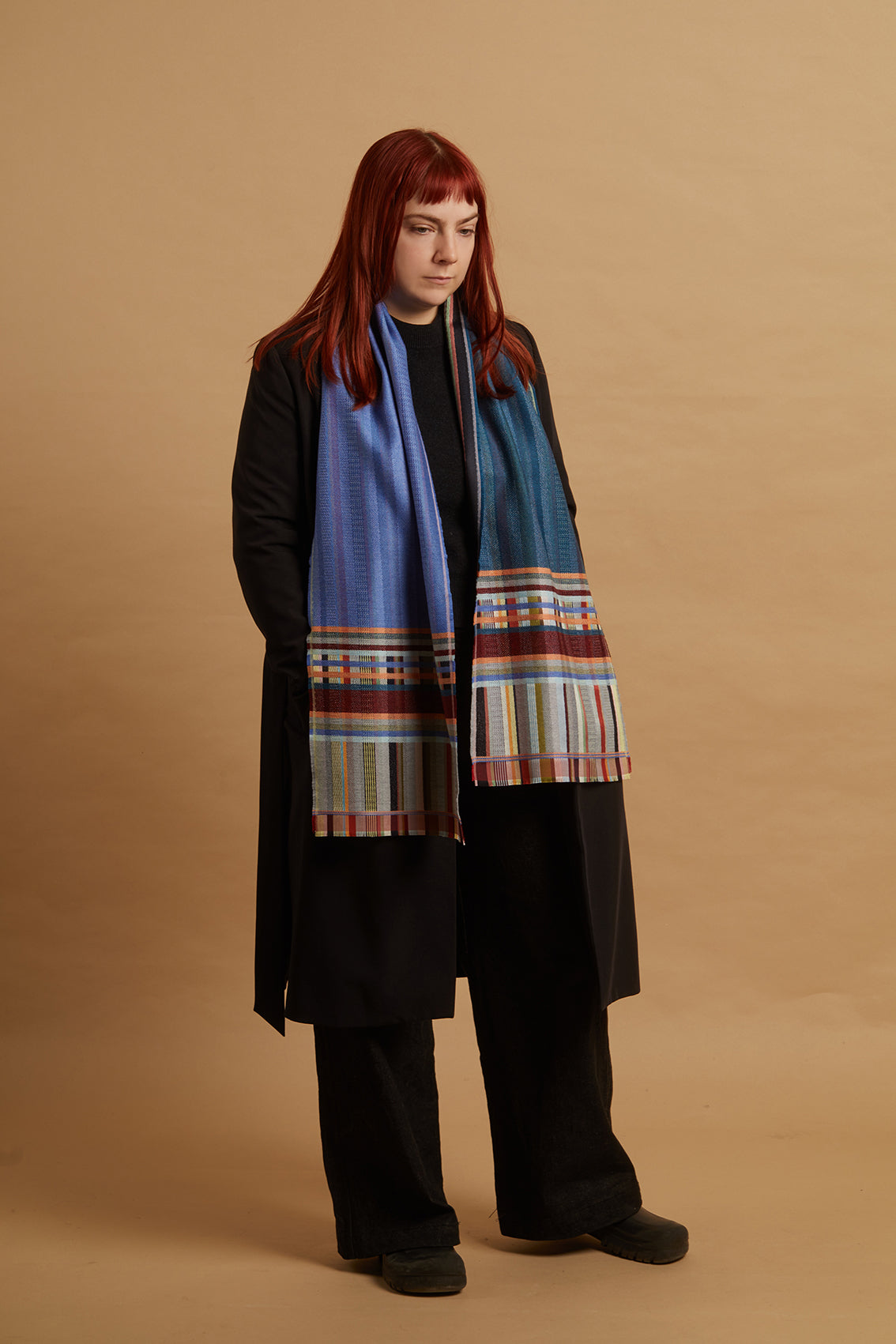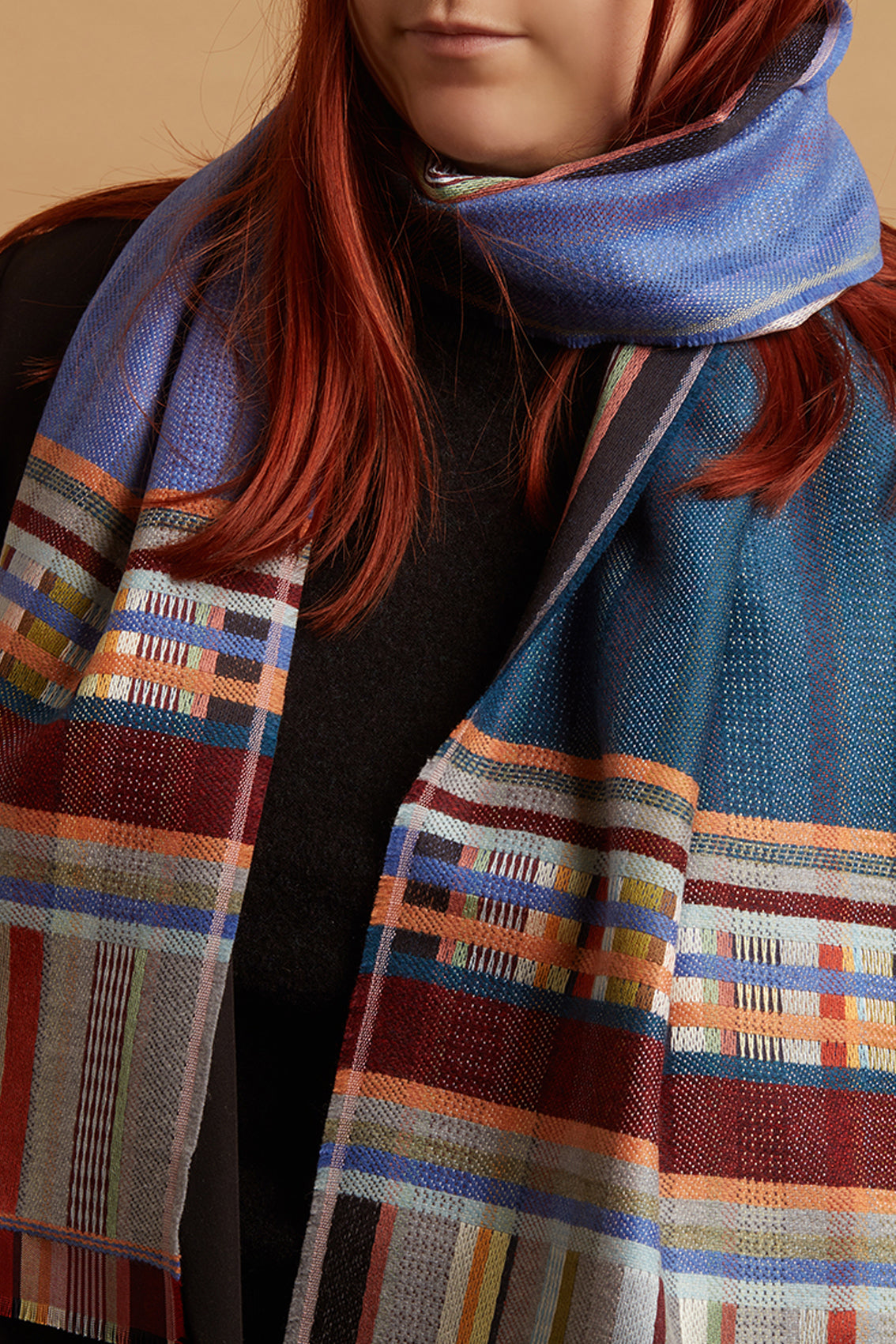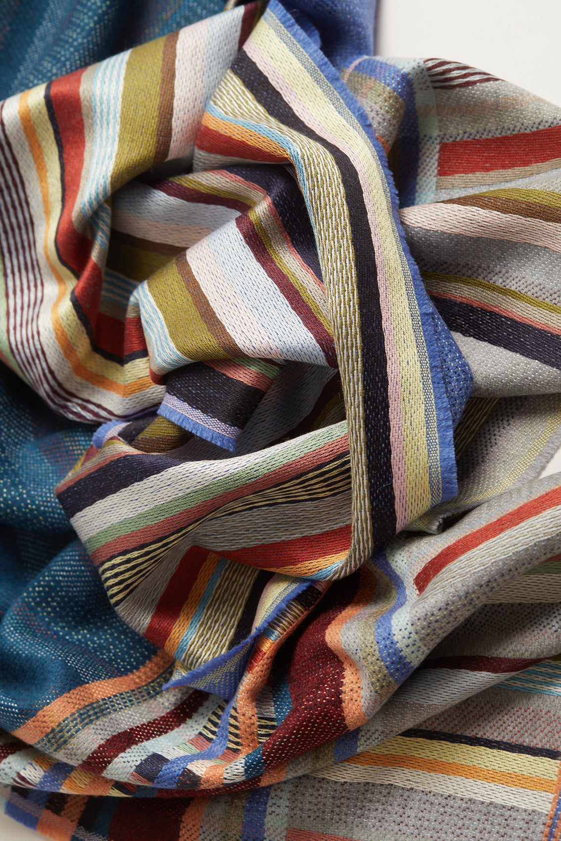Rosa features a duo of bold lambswool woven on one-side with the silk stripe warp on the other. The border mixes both silk & lambswool in woven blocks and stripes, finished with a neat fringe.