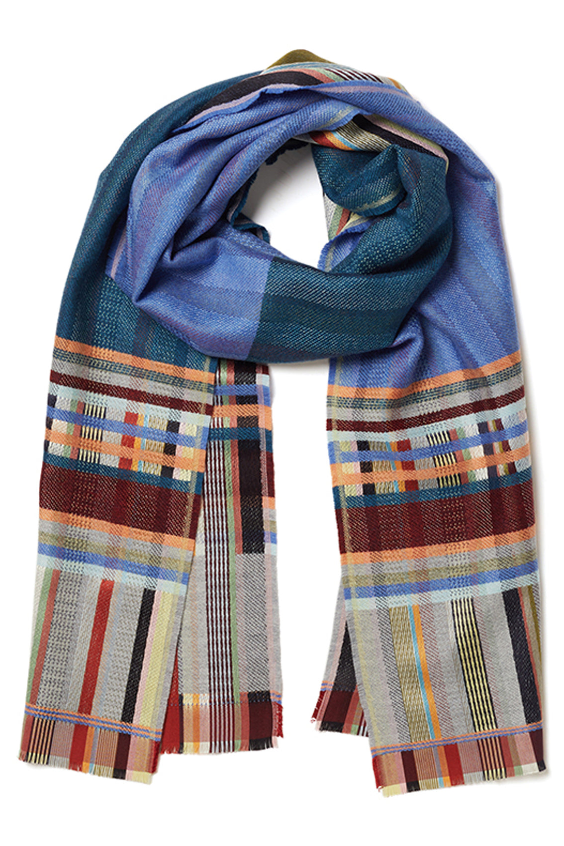 Deep inky turquoise and cornflower blue form the base of this scarf. The border features a contrasting combination of soft grey and mulberry which sit next to playful pops of peach and bright aqua.