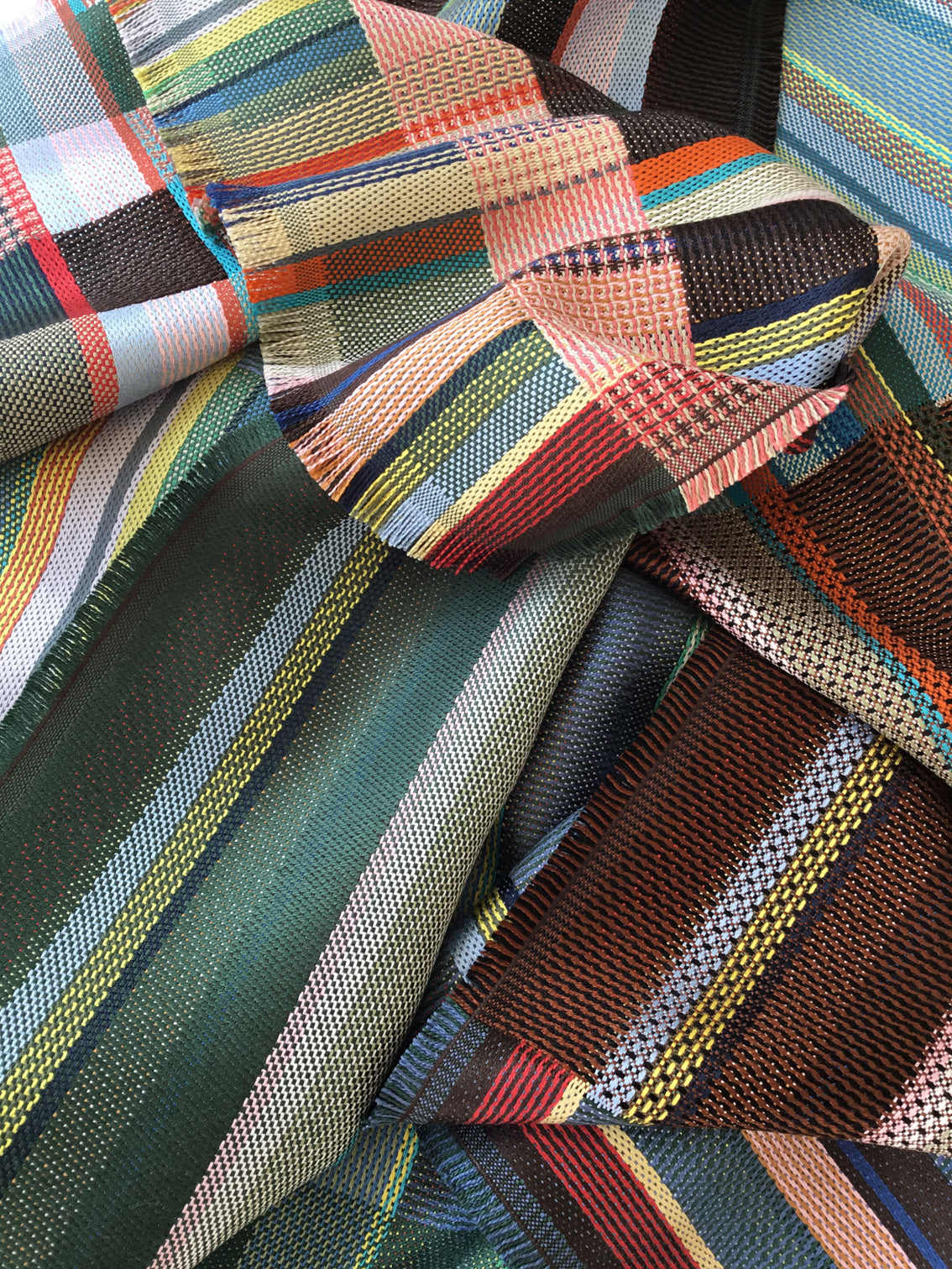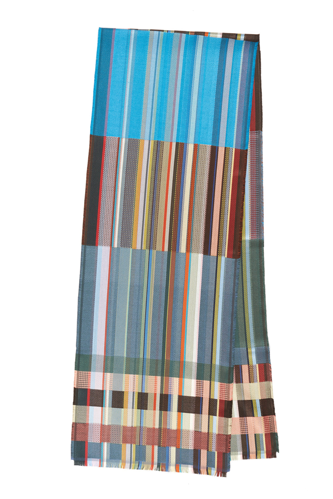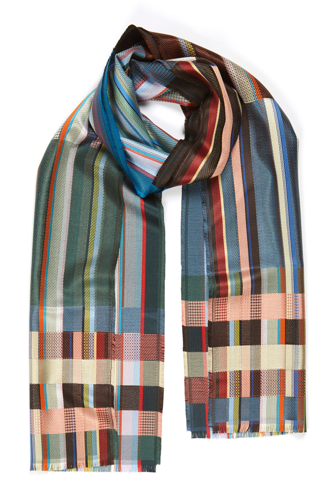 The Sandro silk scarf is composed of harmonious asymmetric stripes and a rich checkerboard of subtle structures at either end, with a beautifully silken, flat finish.