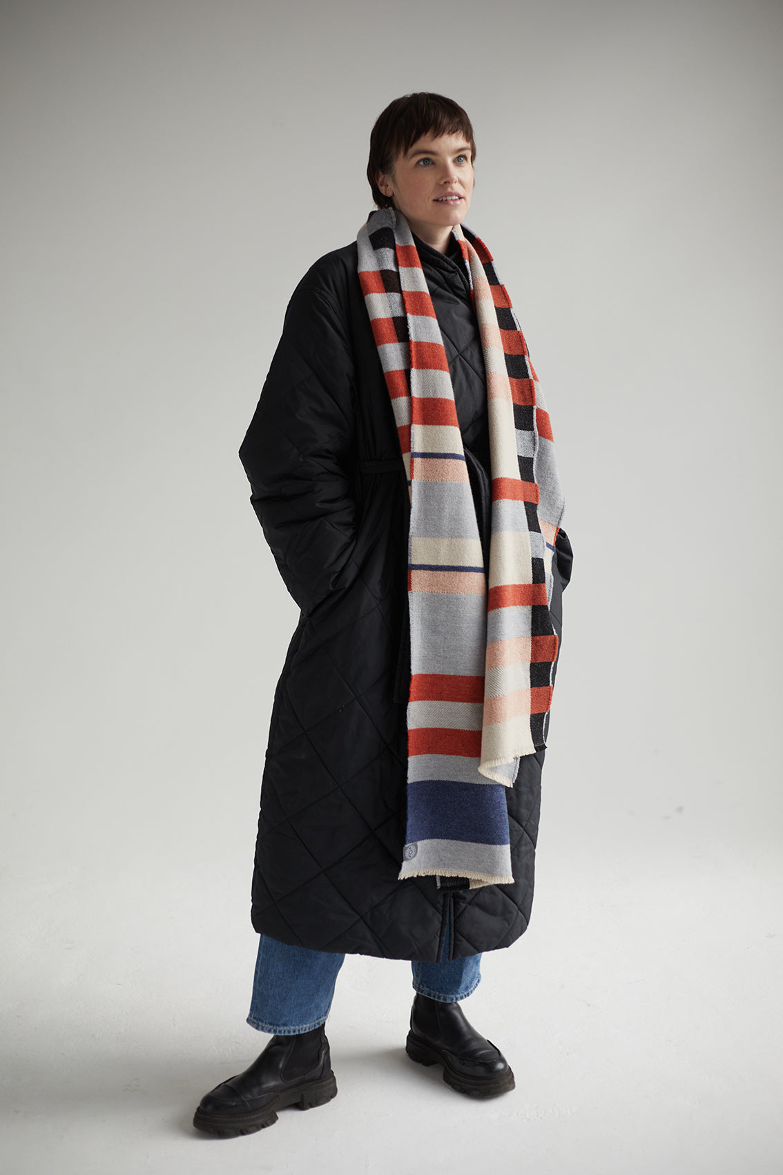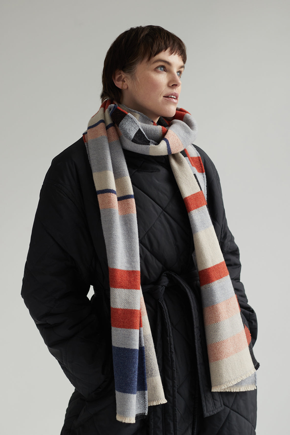 Wallace Sewell's Stölzl wraps were designed as part of the collection for the 2019 Bauhaus centenary celebrations. Emma and Harriet were authorised to create a re-edition of Gunta Stölzl’s original ‘Prellerdecke’ blanket, woven for the dormitories at the Bauhaus Dessau in 1926.