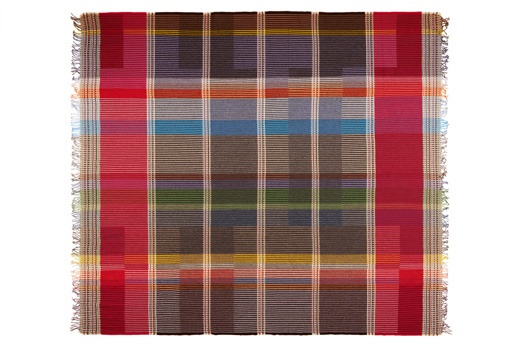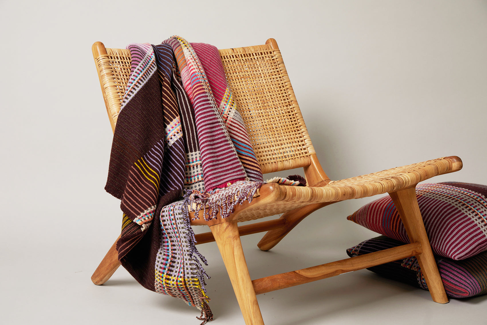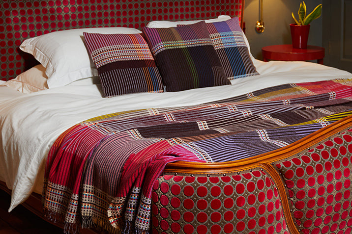 Woven in merino lambswool, our Pinstripe throws combine bold coloured blocks with fine, detailed vertical stripes. This double-sided design also has a contrasting pixelated border and makes a stunning addition to a room.