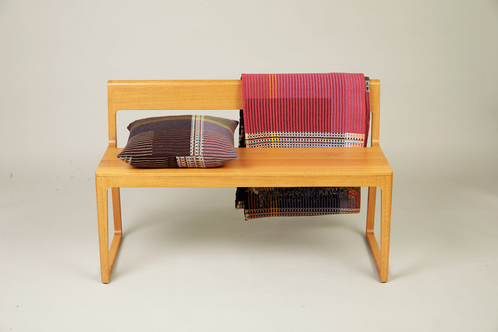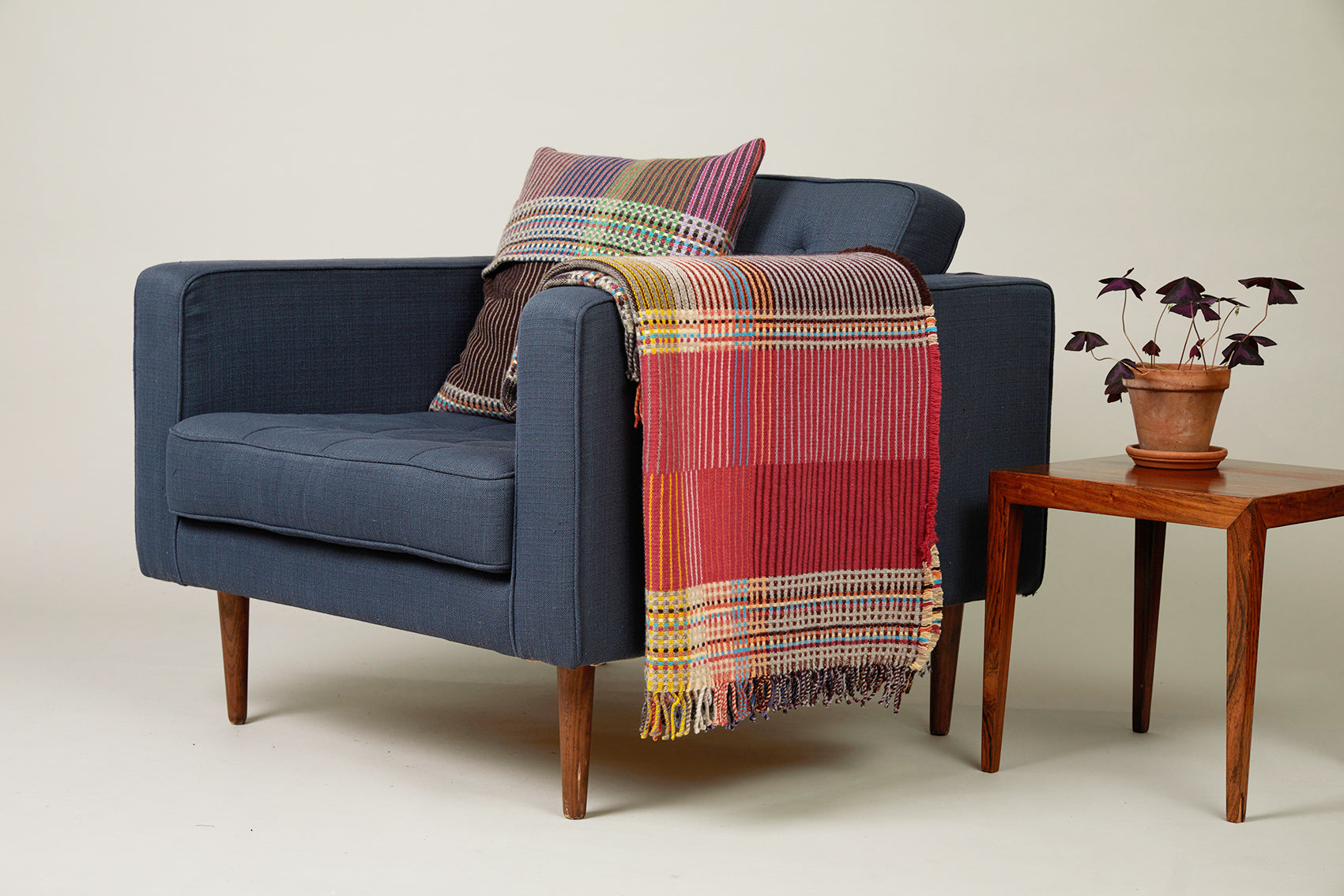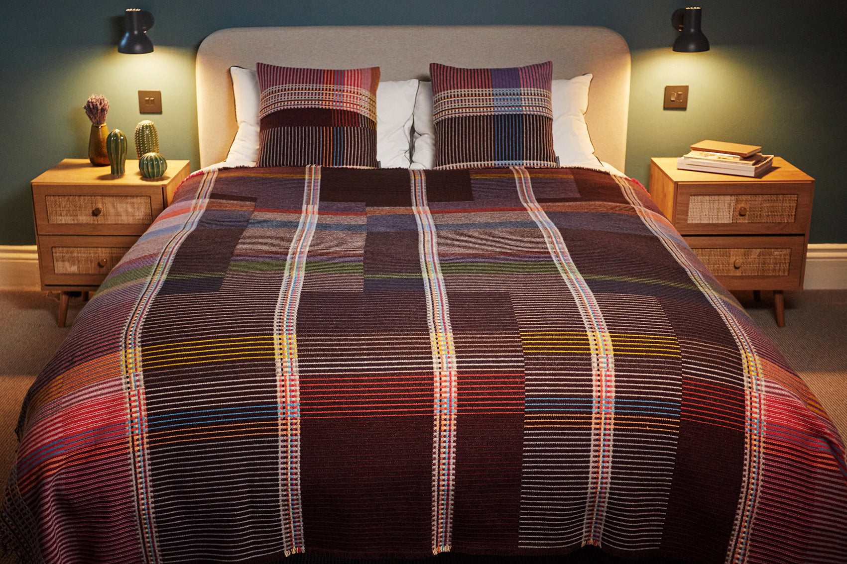 Woven in merino lambswool, our Pinstripe throws combine bold coloured blocks with fine, detailed vertical stripes. This double-sided design also has a contrasting pixelated border and makes a stunning addition to a room.