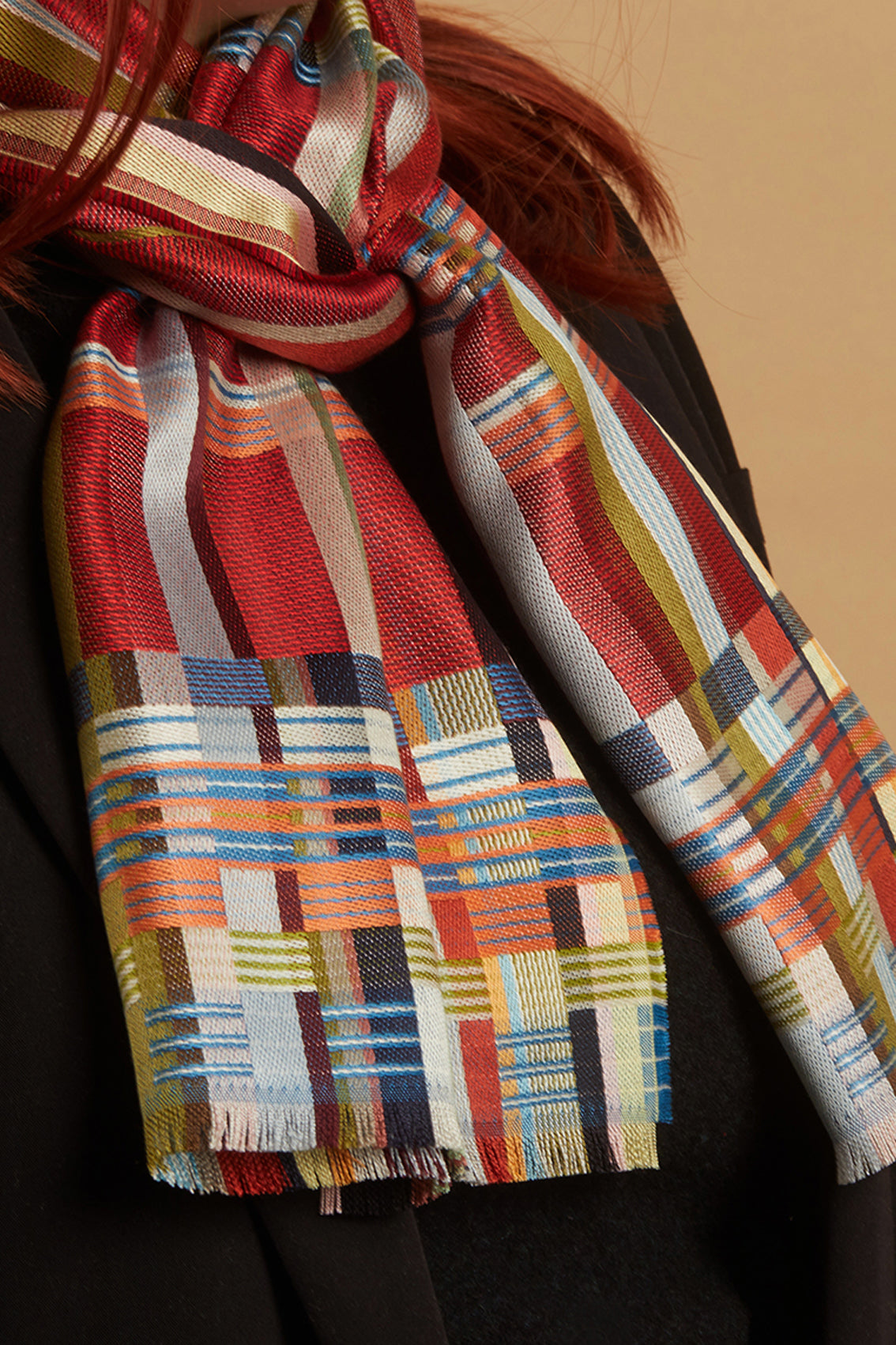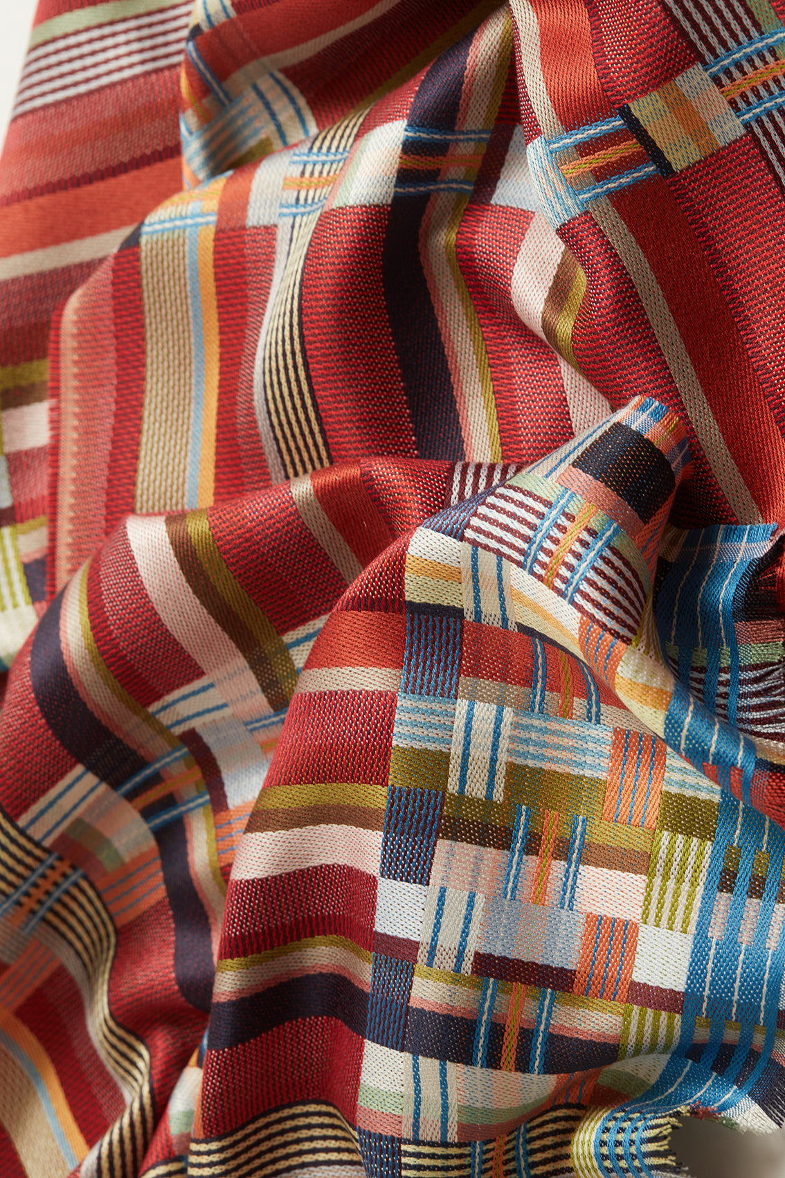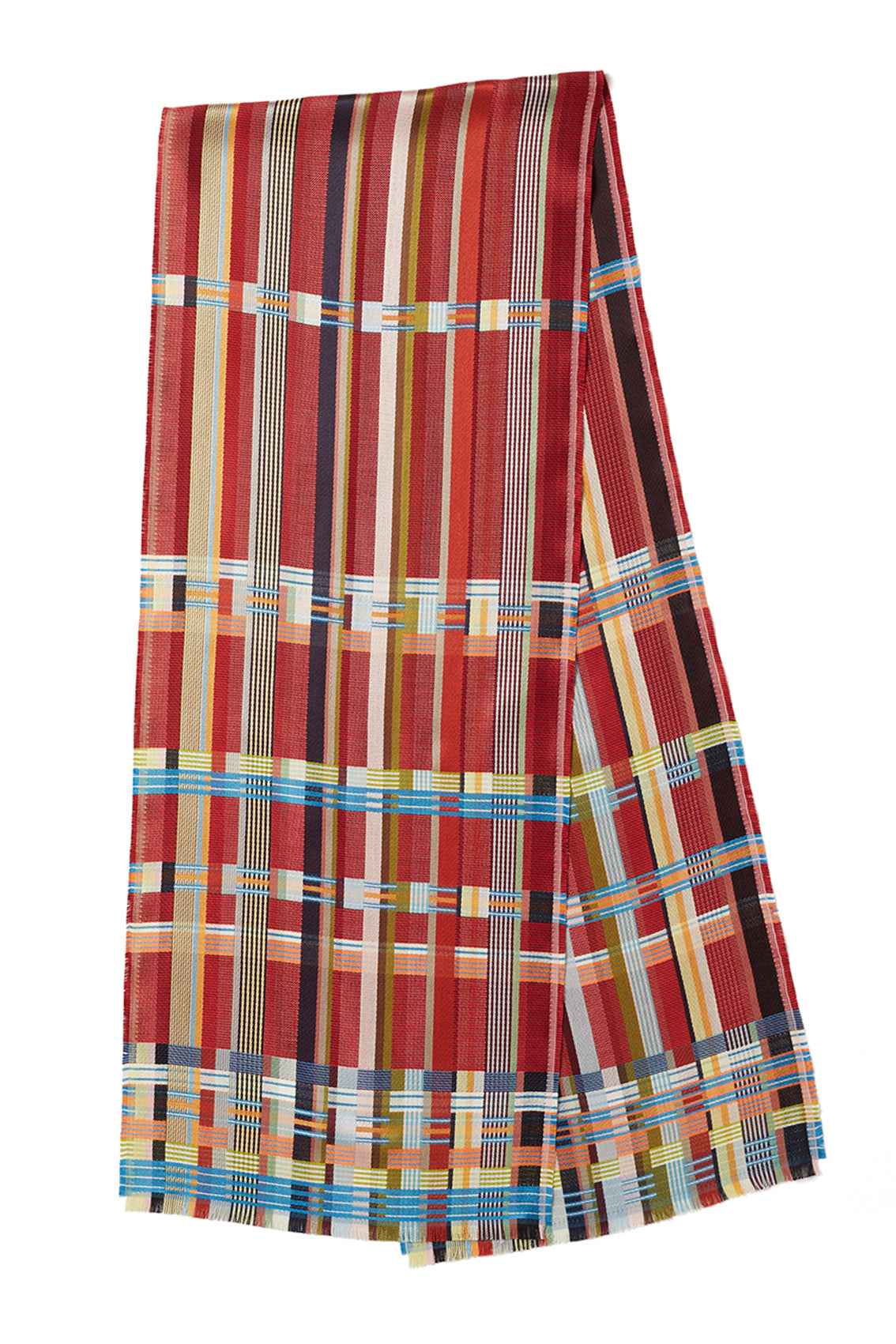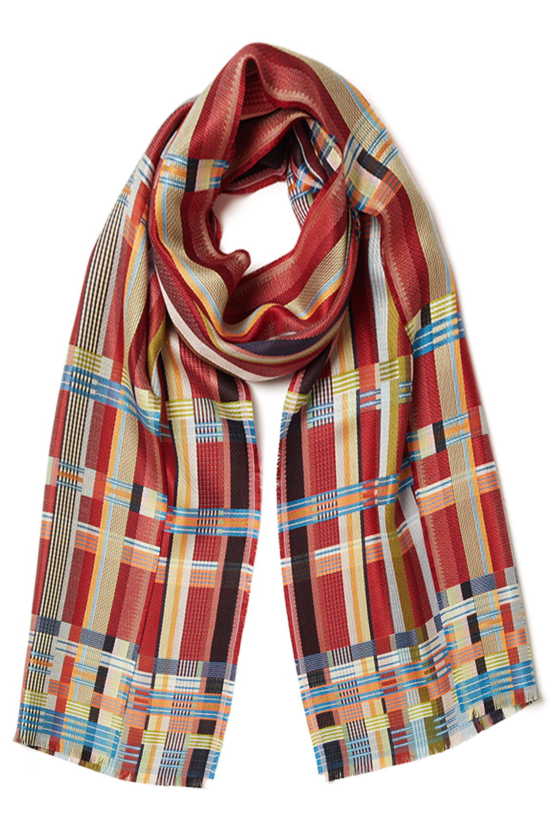 Rich cherry red forms the base of this scarf whilst fresh pops of mid blue, sherbet orange and pale yellow are an unexpected compliment to the jewel tone.