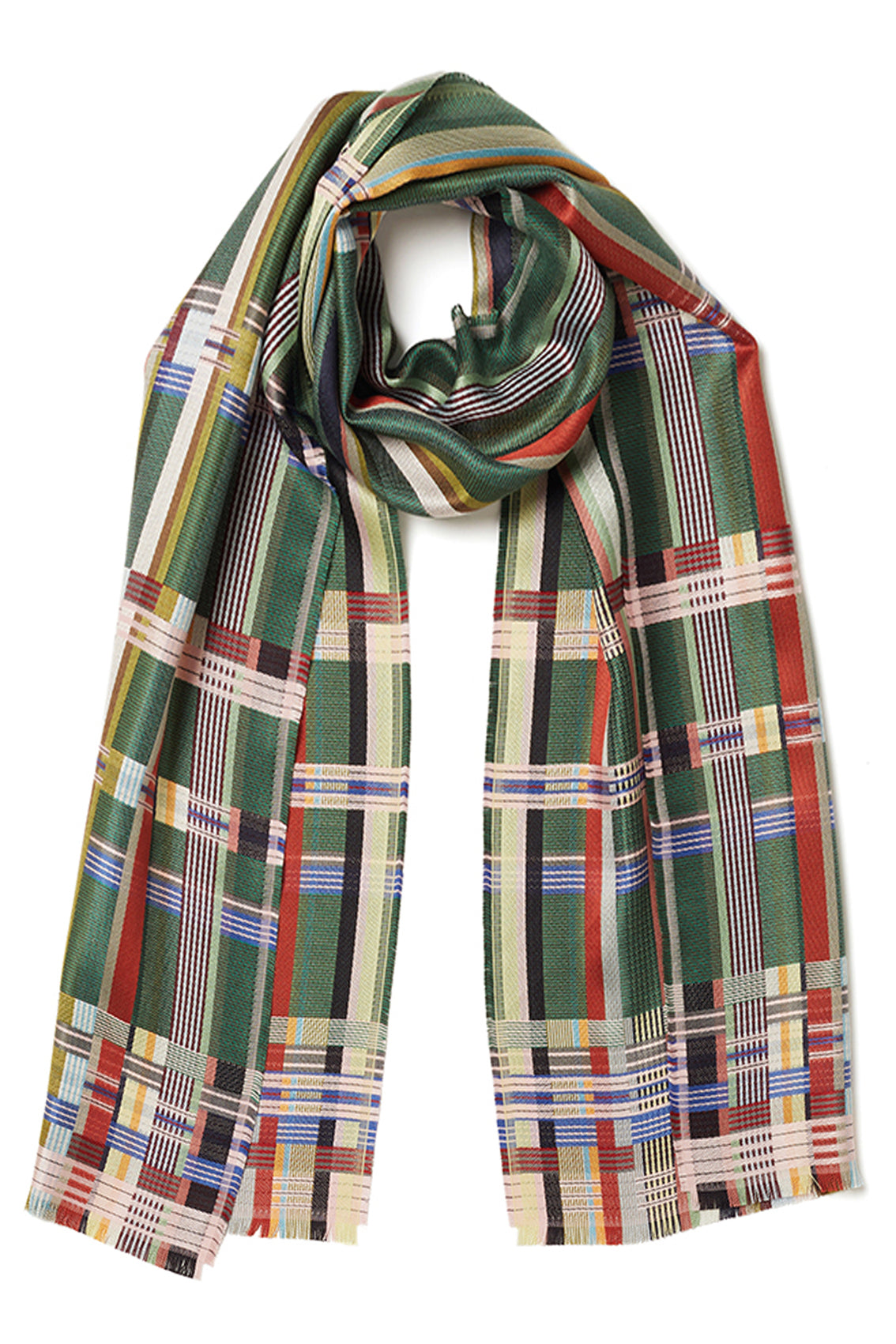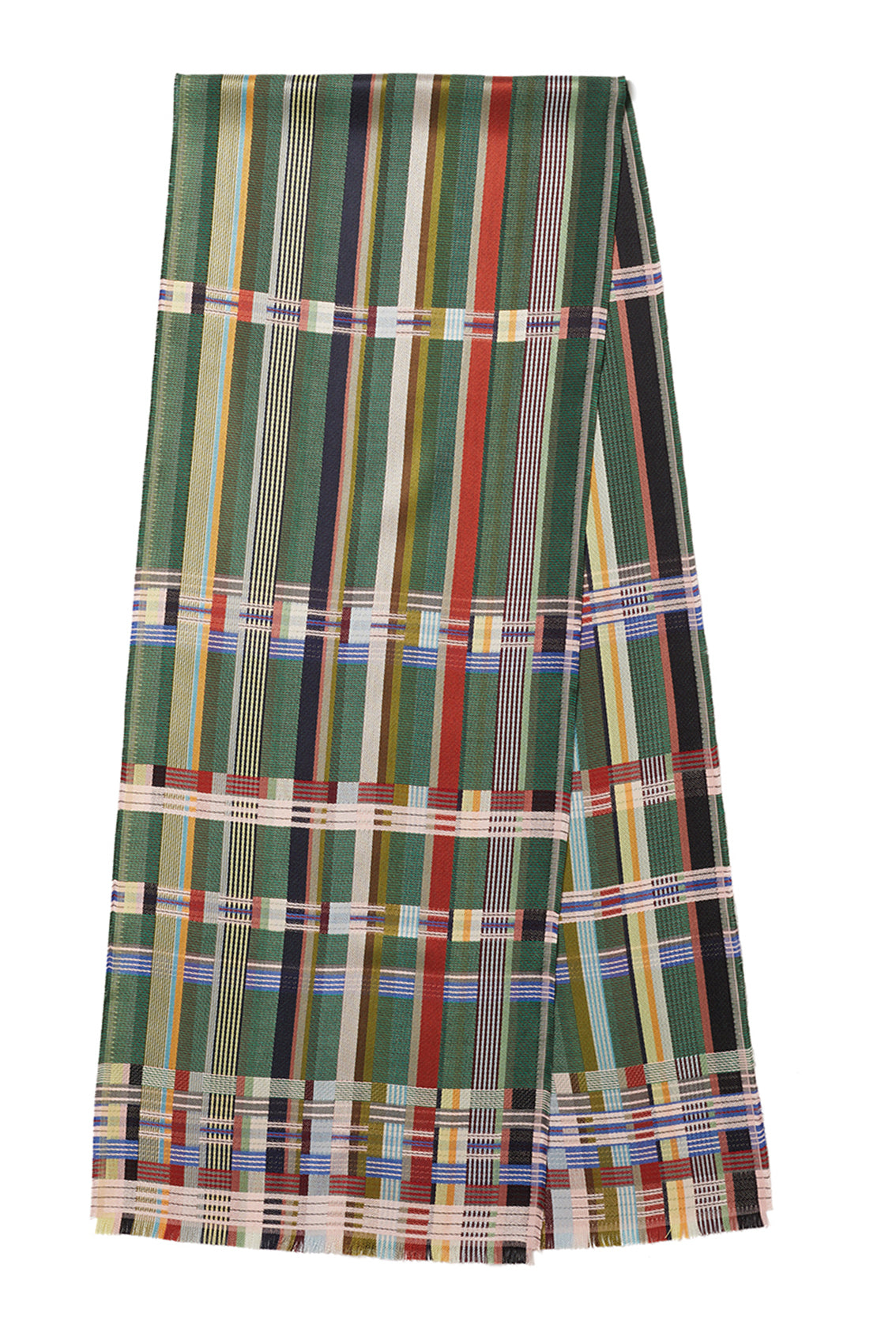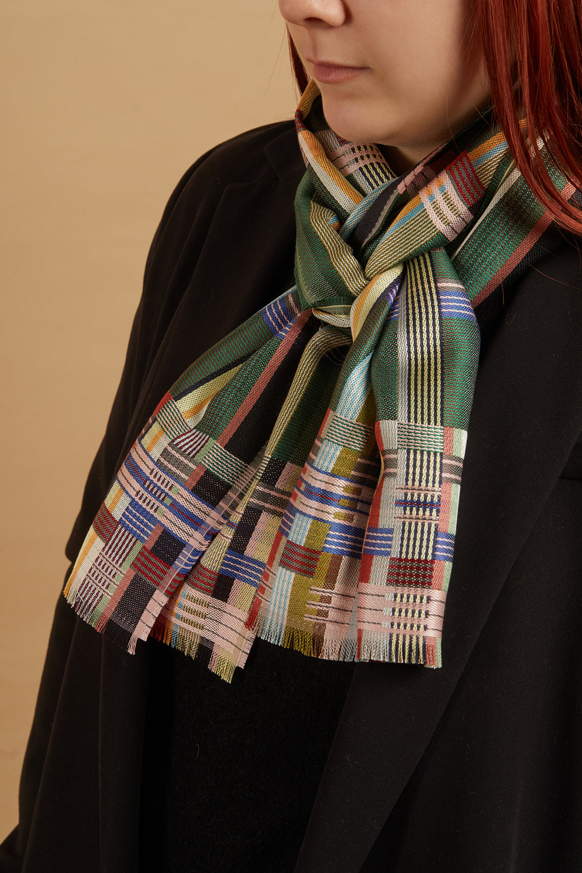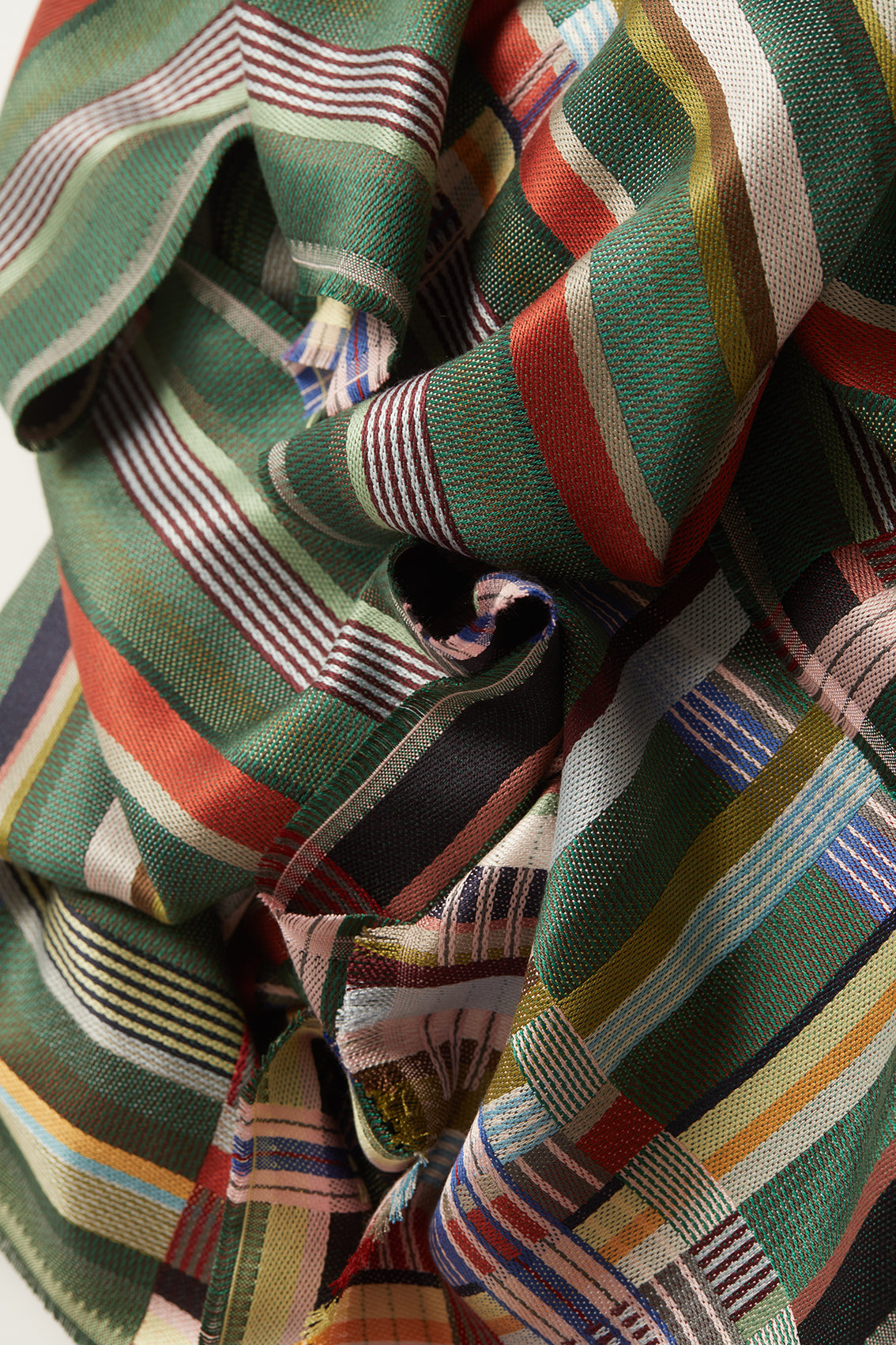 Violette is a graphic, pure silk scarf featuring a multidirectional stripe of bold solid colour, against intricate pinstripes. Details are scattered throughout the scarf and condense in the heavily patterned border.